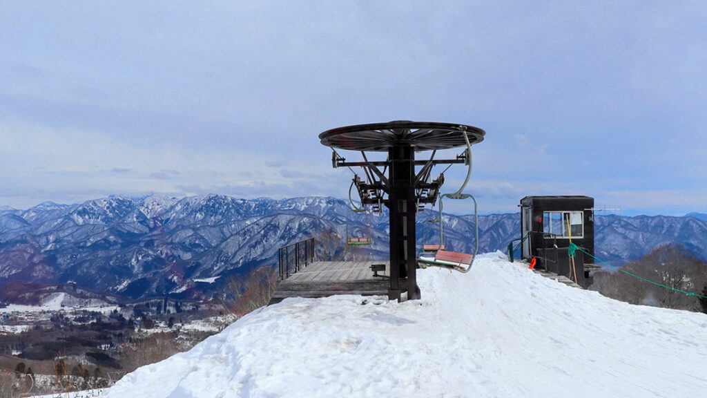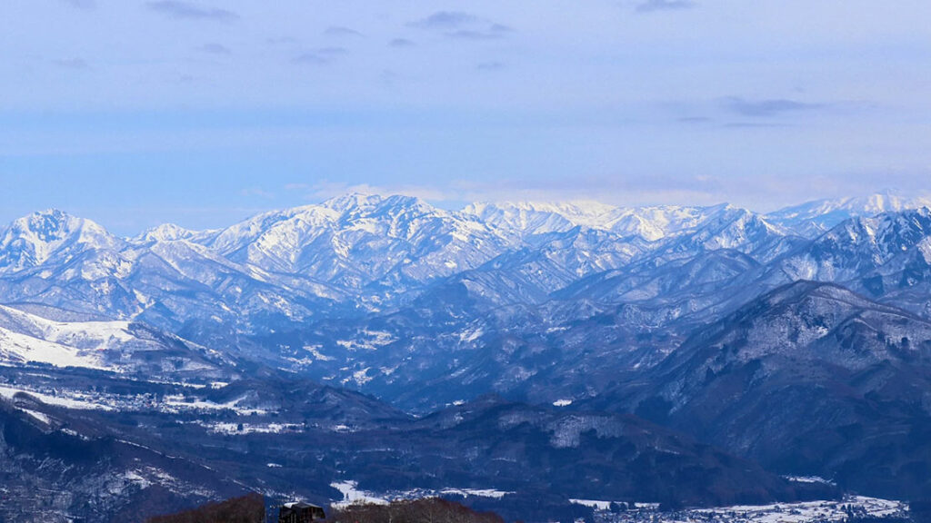 山頂は、白馬三山を正面に捉え、まるで天空に浮かんでいるような感覚に包まれる場所だ。スキー場というより、壮大で開放的な空気が流れている。とにかく視界が一気に開け、白馬岳・杓子岳・白馬鑓ヶ岳がドーンと並び立つ。山の “壁” が迫るというより、巨大なパノラマが眼前に広がる印象だ。