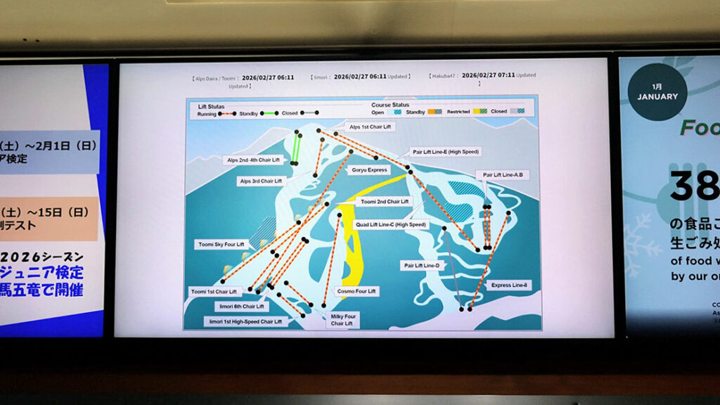 Hakuba47とは共通リフト券で連携しており、五竜+Hakuba47を自由に行き来できる。2スキー場合わせてコース数は24、リフト17基、ゴンドラ2基という充実の規模で、白馬エリアを思いっきり満喫できるシステムだ。