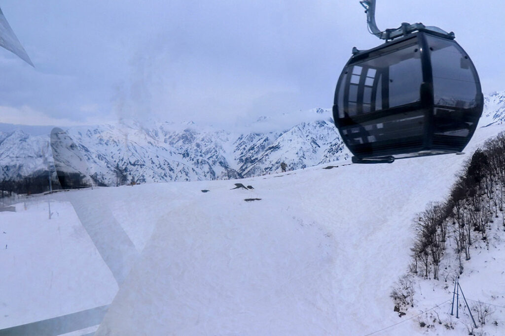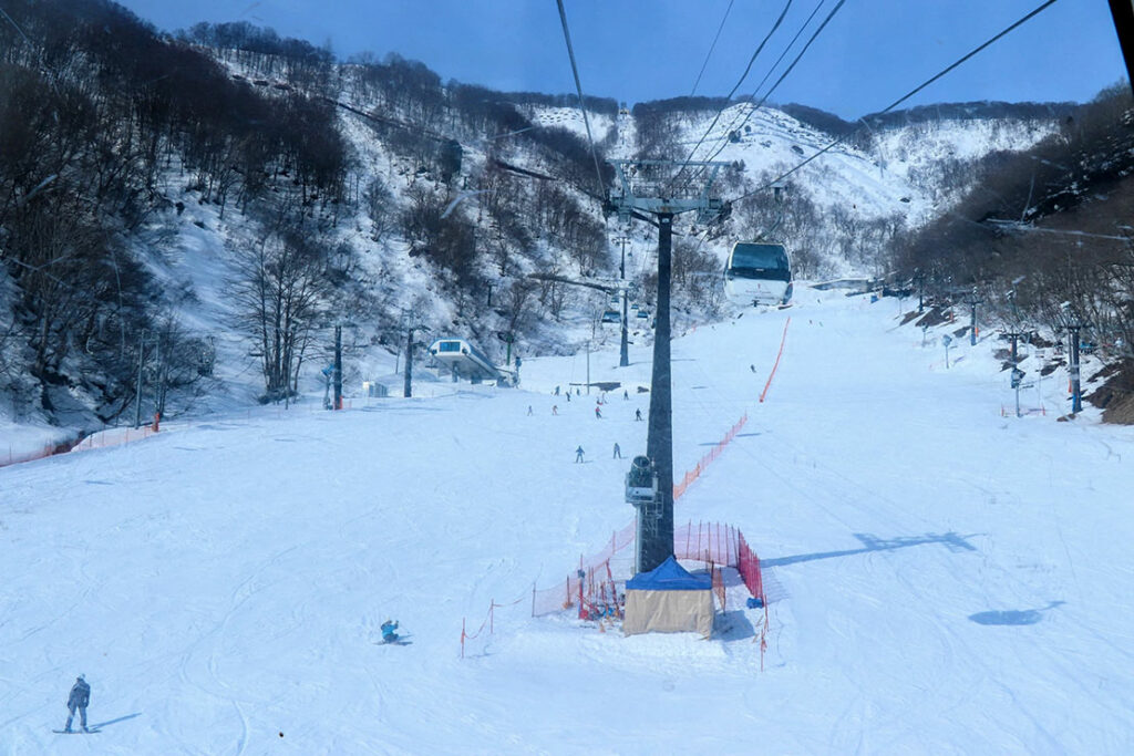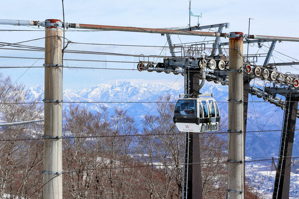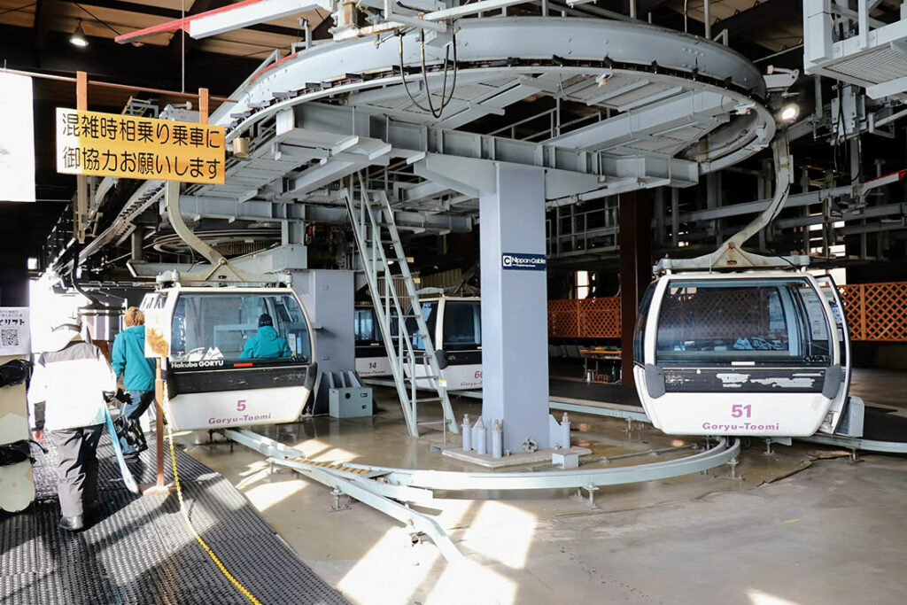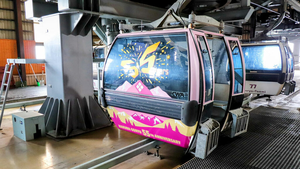 55周年記念の特別ラッピングゴンドラは、全82台のうち1台だけが運行する超レア仕様。通常のゴンドラと同じ運行サイクルのため、狙って乗るのはまさに “難関中の難関” で、ちょっとしたレアガチャ状態だ。ラッピングゴンドラを引き当てたクルーのテンションは高かった。天気は良かったが、車内は粉雪が舞いさらに特別感を引き立てていたぞ。