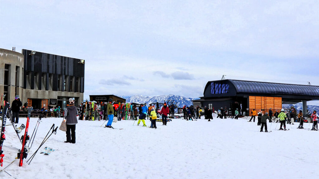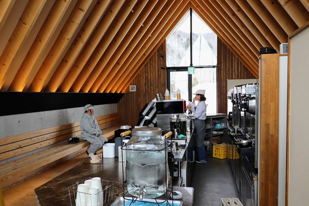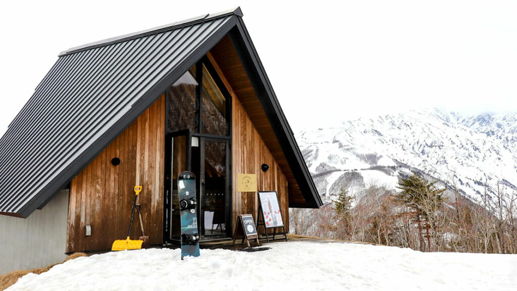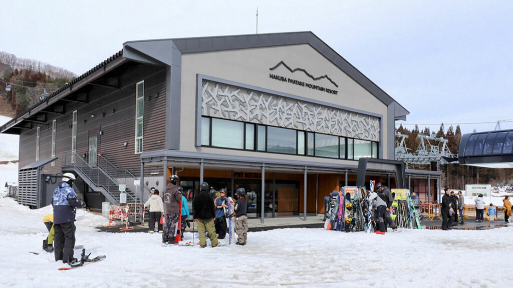 白と木材を基調にした、岩岳らしいナチュラルデザインが印象的なベースセンター。北アルプスの山並みに溶け込むような落ち着いた外観が特徴だ。