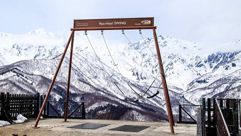 山頂デッキのすぐ横に設置された大型ブランコ「ヤッホー!スウィング」。北アルプスの大パノラマに向かって漕ぎ出せば、まさに “空へ飛び出す” ような感覚に包まれる。足元はすぐに斜面へ落ち込んでいるため、ひとこぎした瞬間、視界は空と山だけになる。これが意外と怖い!