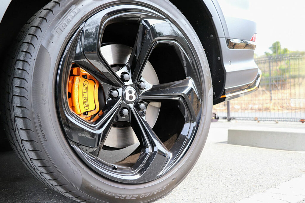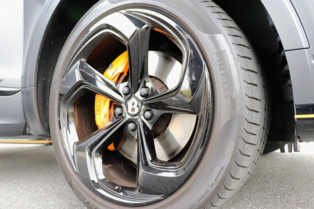 ホイールは22インチBlack Edition専用のブラック仕上げ。タイヤサイズは前後同サイズの285/40R22。オレンジ色のブレーキキャリパーは2.4tの車体を確実停止させる。
