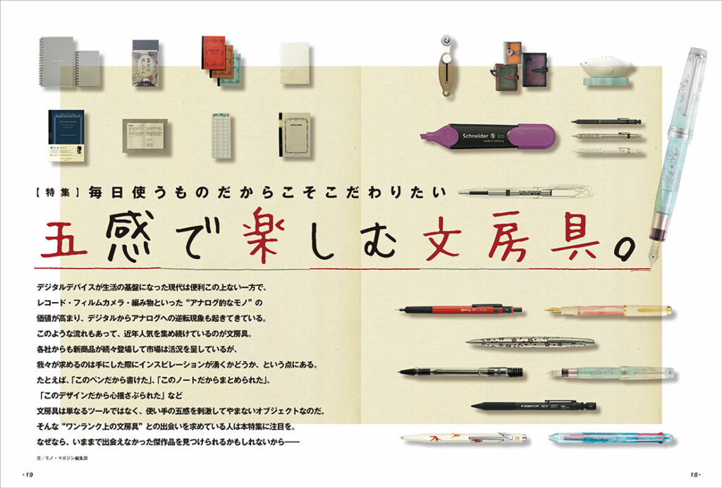 デジタルデバイスが生活の基盤になった現代は便利この上ない一方で、レコード・フィルムカメラ・編み物といった “アナログ的なモノ” の価値が高まり、デジタルからアナログへの逆転現象も起きてきている。このような流れもあって、近年人気を集め続けているのが文房具。各社からも新商品が続々登場して市場は活況を呈しているが、我々が求めるのは手にした際にインスピレーションが湧くかどうか、という点にある。たとえば、「このペンだから書けた」、「このノートだからまとめられた」、「このデザインだから心揺さぶられた」など文房具は単なるツールではなく、使い手の五感を刺激してやまないオブジェクトなのだ。そんな “ワンランク上の文房具” との出会いを求めている人は本特集に注目を。なぜなら、いままで出会えなかった傑作品を見つけられるかもしれないから――