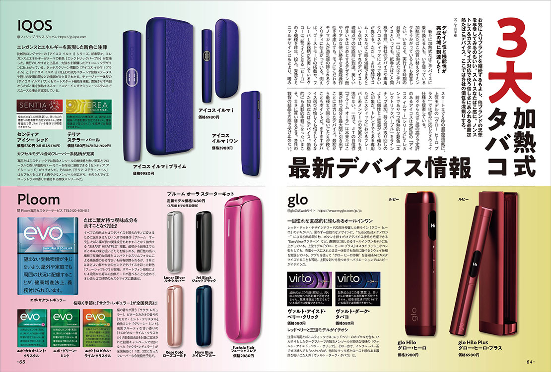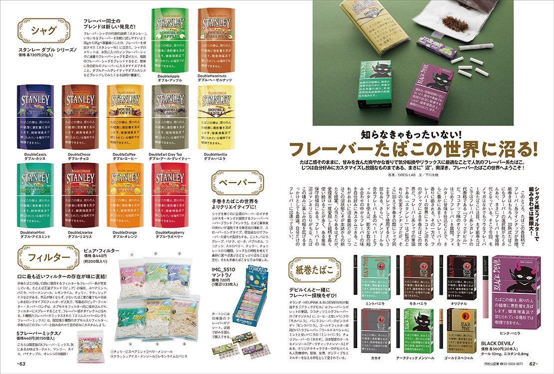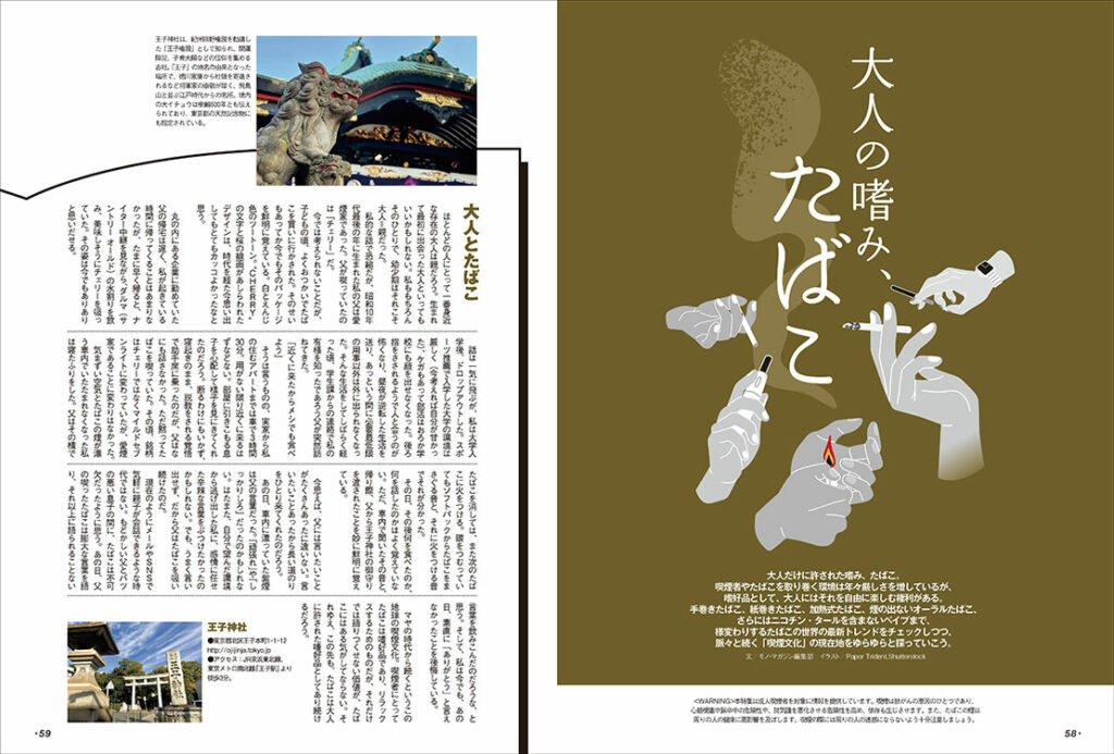 大人だけに許された嗜み、たばこ。ひとくちにたばこといっても手巻き、紙巻き、加熱式に加え、煙の出ないオーラルたばこやニコチン・タールを含まないベイプまで選択肢は多く、脈々と続く “喫煙文化” は様変わりし続けている。本特集では最新トレンドを探りつつ、映画のなかで重要な小道具として描かれるたばこや戦場におけるたばこの重要性など、非喫煙者が読んでも楽しい情報を収録。一服するつもりでお楽しみあれ!