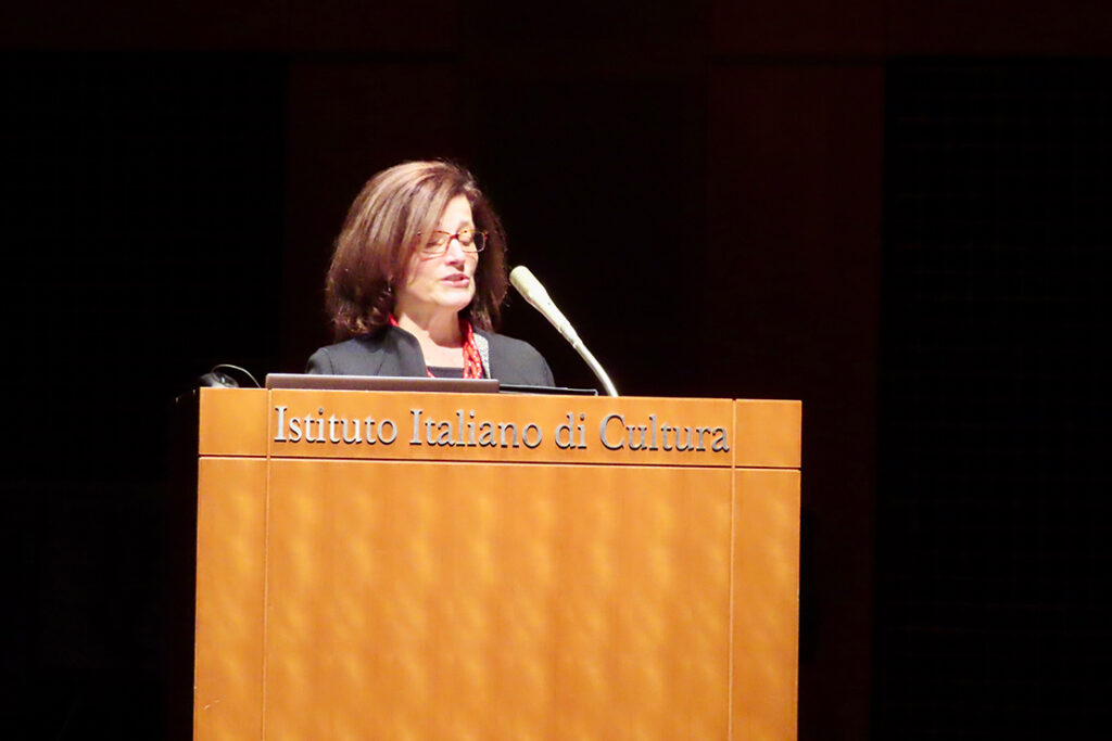 講演会の冒頭では、イタリア文化会館シルヴァーナ・デマイオ(Silvana De Maio)館長が登壇し挨拶を述べた。