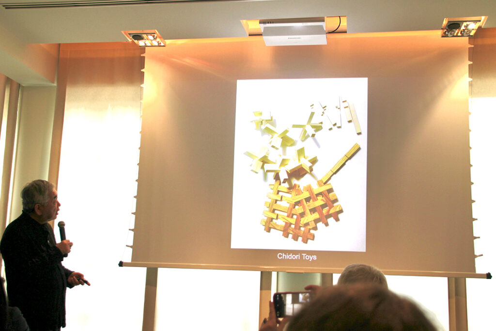 「千鳥」という、組み木のような木製の玩具もある。ひとつの部材は、3センチ角の木の棒で、切り欠かれて残る部分は1センチくらいと非常に細い。組み合うことによって強くなるそう。