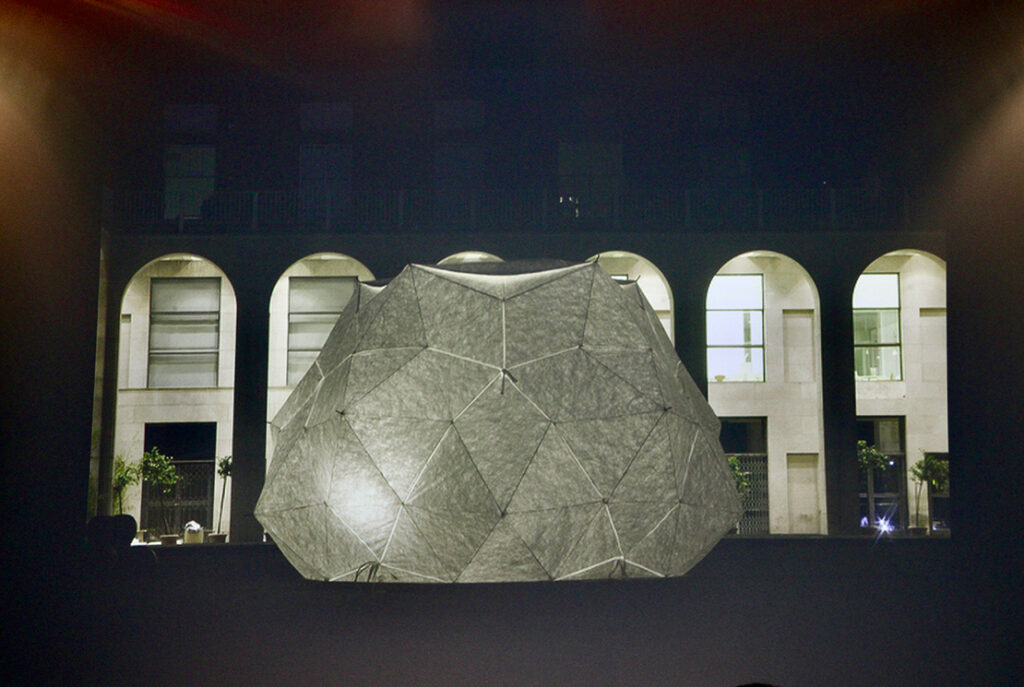 15本の傘を繋ぎ合わせたユニークな構造で、正20面体の各正三角形を傘に置き換えている。傘の骨が作る三角形を利用して、全体をトラス構造にし、すべてのディテールは通常の傘を応用しているサステナブルな作りだ。