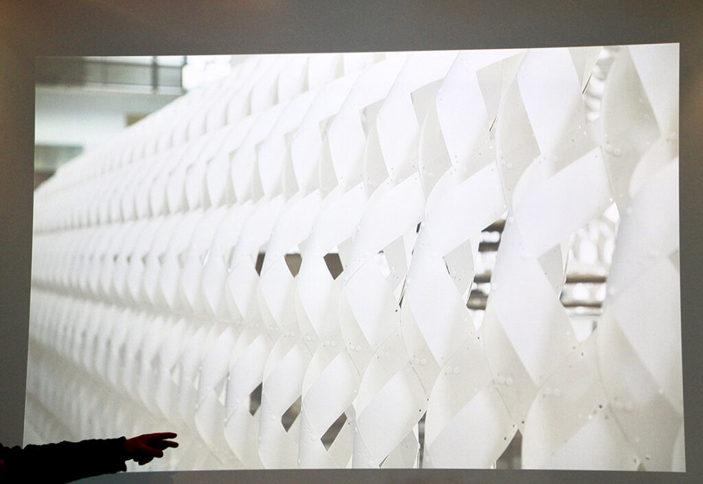 厚さ1mmのコルテン鋼のストライプを使用し、メッシュ状に編み込んだハイブリッド構造を採用。カーボンファイバーで補強することで厚みを最小限に抑え、視覚的な軽やかさを強調した。