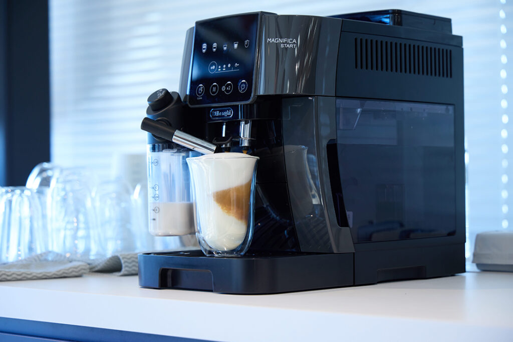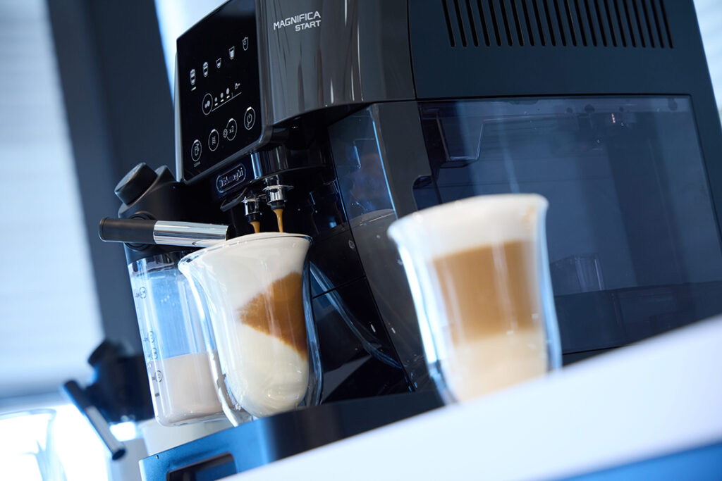 本格ラテマキアートまでワンタッチ。全自動で自宅でも上質なミルクメニューを手軽に楽しめる新モデル『マグニフィカ スタート ミルクモデル』。4つの本格コーヒーメニューに加え、給湯機能も搭載しており、全自動だから忙しい朝でもおいしい一杯をすぐに淹れられる。