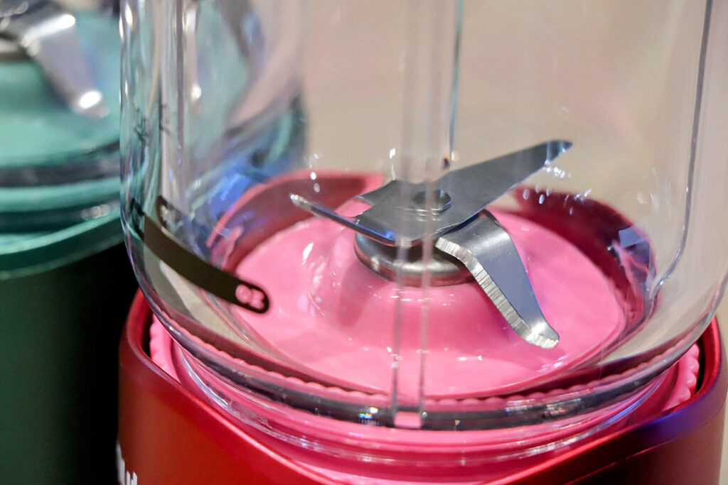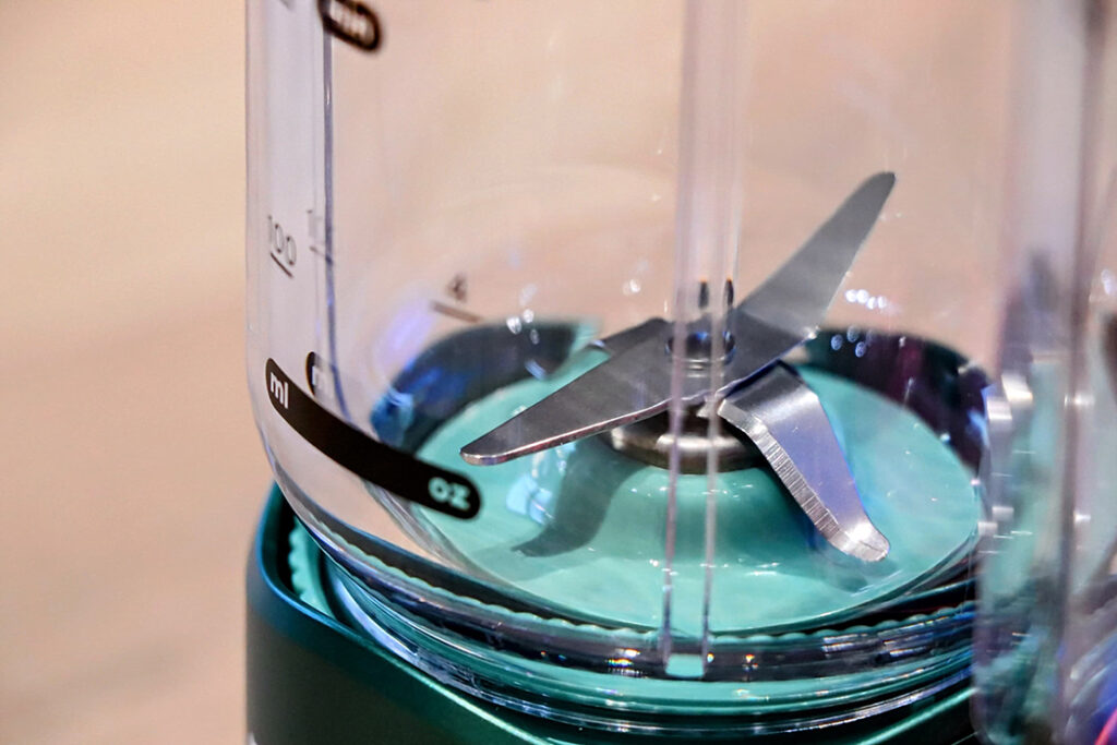 独自のブレードシステムで、粉砕・撹拌・引き込みを同時に行う設計。7.4V駆動のモーターと組み合わせることで、携帯型としては驚くほど高い破砕力を実現している。氷や冷凍フルーツも一瞬で砕くハイパワーで、スピーディーに調理が可能だ。