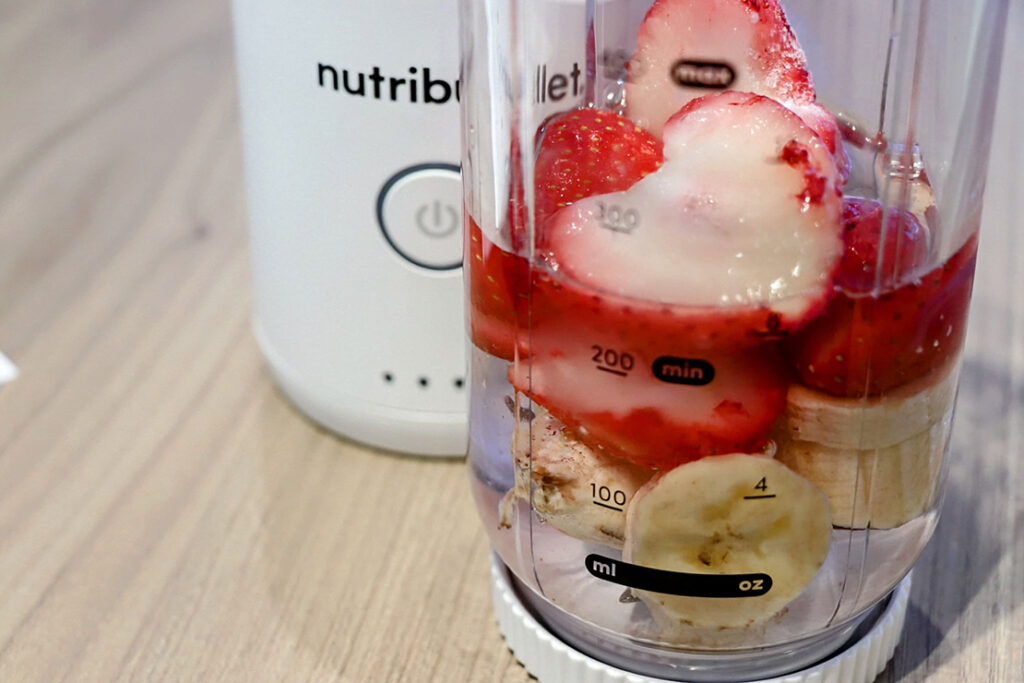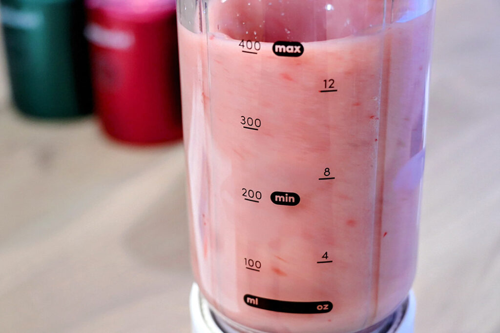 いちご(冷凍)80g、バナナ60g、水をボトルのminライン(200cc)まで入れてフタを閉め、あとはボタンを押すだけ。シンプルな “30秒の自動ブレンドサイクル” で仕上がる。素材はブレンド前、カップの中でそれぞれの色がきれいに重なり、見た目も楽しい。