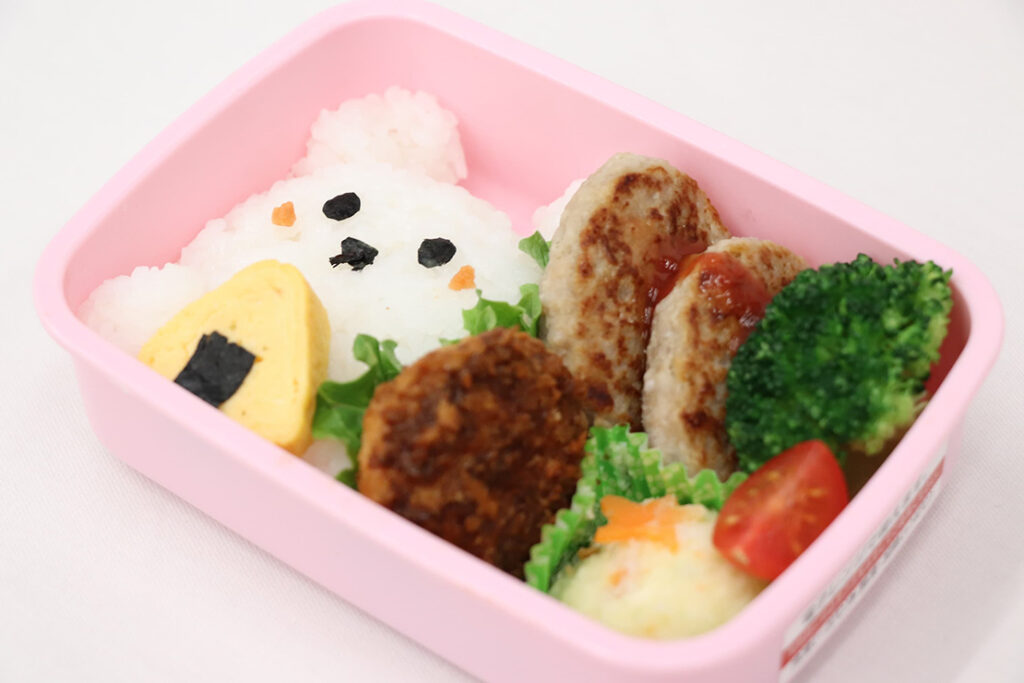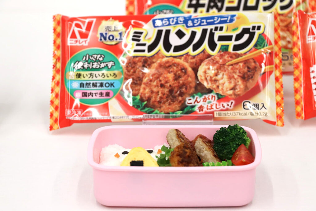 冷凍調理ハンバーグカテゴリー売上No.1※のハンバーグは、独自の「Wベルトグリル製法」により、外はこんがり香ばしく、中はふっくら。冷めてもやわらかい食感を実現している。自然解凍も可能で、お弁当に使いやすい「小さな便利おかず」シリーズの一品だ。