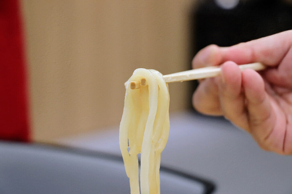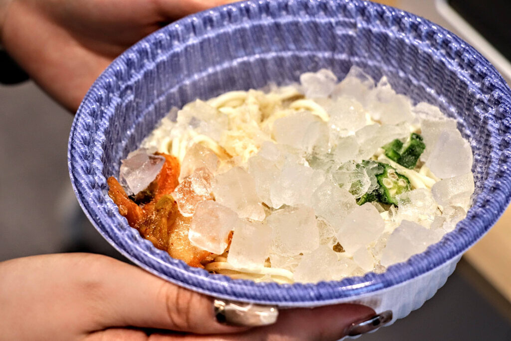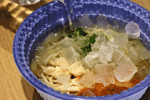 この氷に水を注ぐことで、麺が一気にキュッと締まり、冷たい状態に仕上がるのだ。