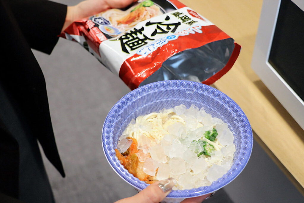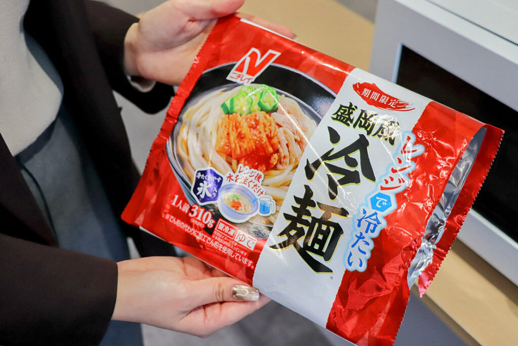 電子レンジで調理する盛岡風冷麺※。氷を使用した独自技術で、電子レンジ調理後に水を注ぐことで冷たく仕上がる。コシのある自家製麺と、さっぱりした酸味とコクのあるスープが特長。自家製キムチ、蒸し鶏、オクラを具材に使用している。
