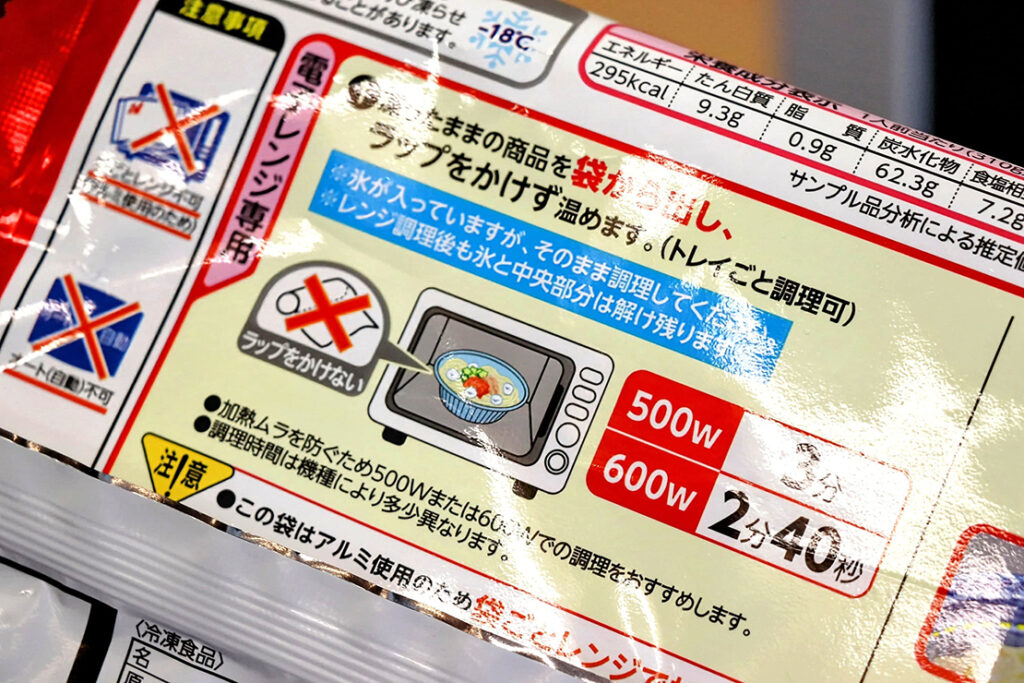 驚いたことに、麺の上には大きな氷がのっている。こんな冷凍食品は見たことがない。500Wで3分、600Wで2分40秒。果たしてどんな仕上がりになるのか。