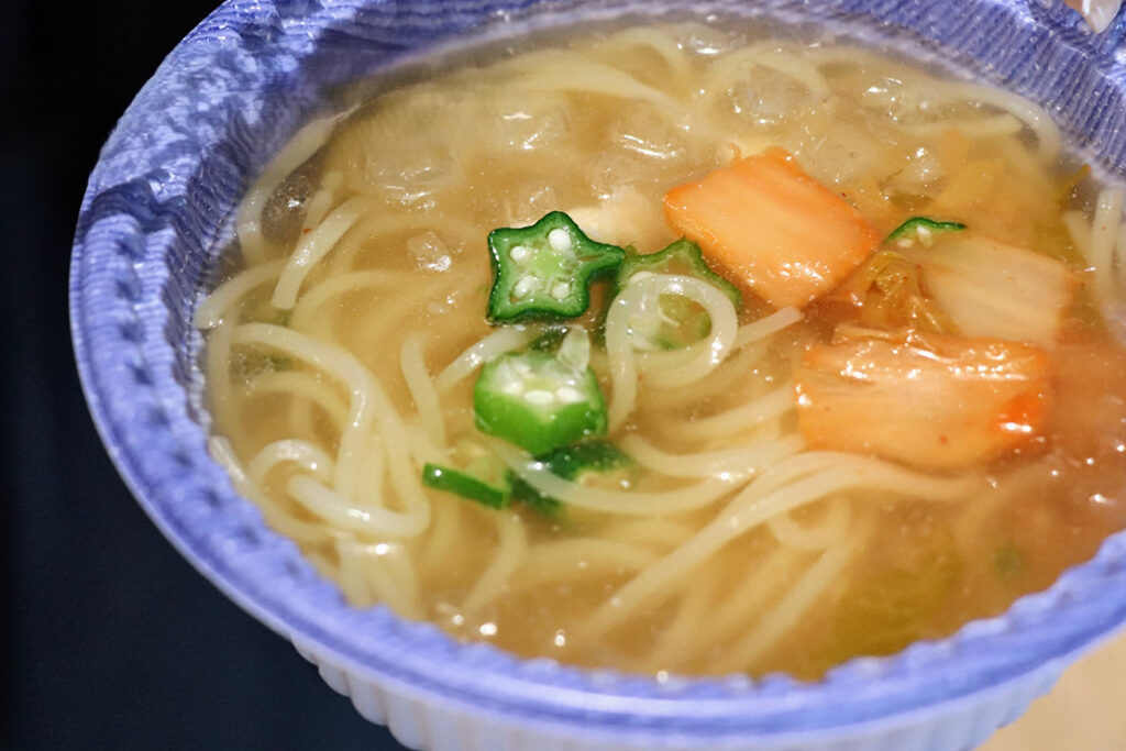 箸で混ぜると、水と氷の作用で麺がキュッと締まり、冷え冷えのスープが完成する。まさに「盛岡風冷麺」そのものの仕上がりだ。調味料を追加する必要もなく、使うのは電子レンジと箸、そして水だけ。