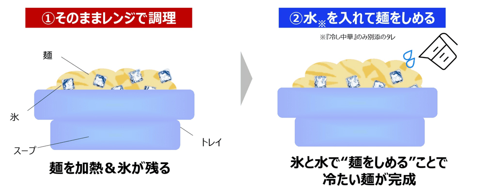 「盛岡風冷麺」「冷し中華」「冷やし豚しゃぶうどん」をラインアップした、レンジで作れる “冷たい麺” シリーズ。“温めるのに冷たい” というユニークな独自技術を活かし、氷がマイクロ波を通しにくい特性を利用して、レンチンだけでキリッと冷えた麺が仕上がる。