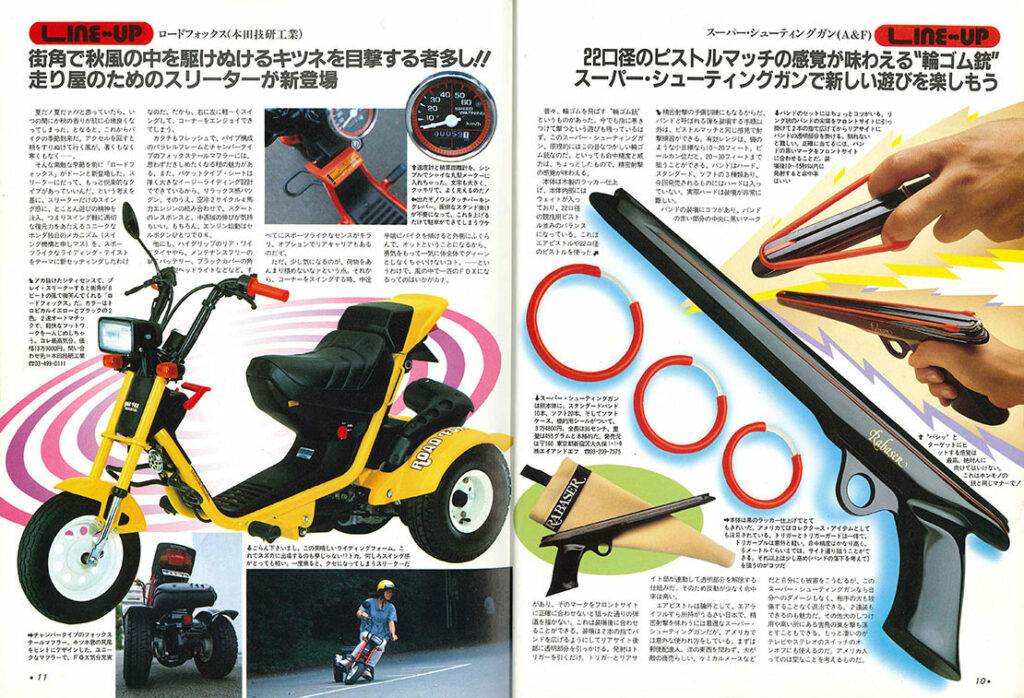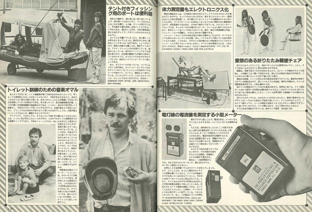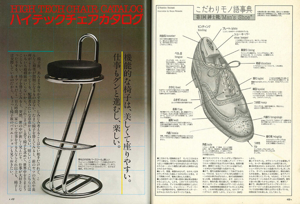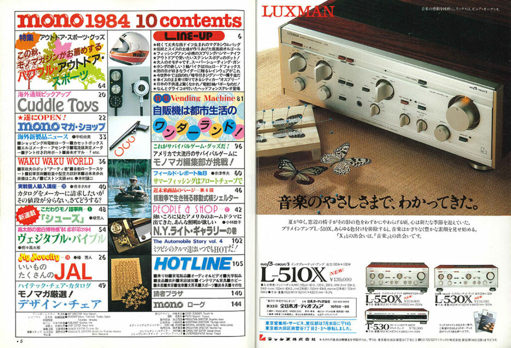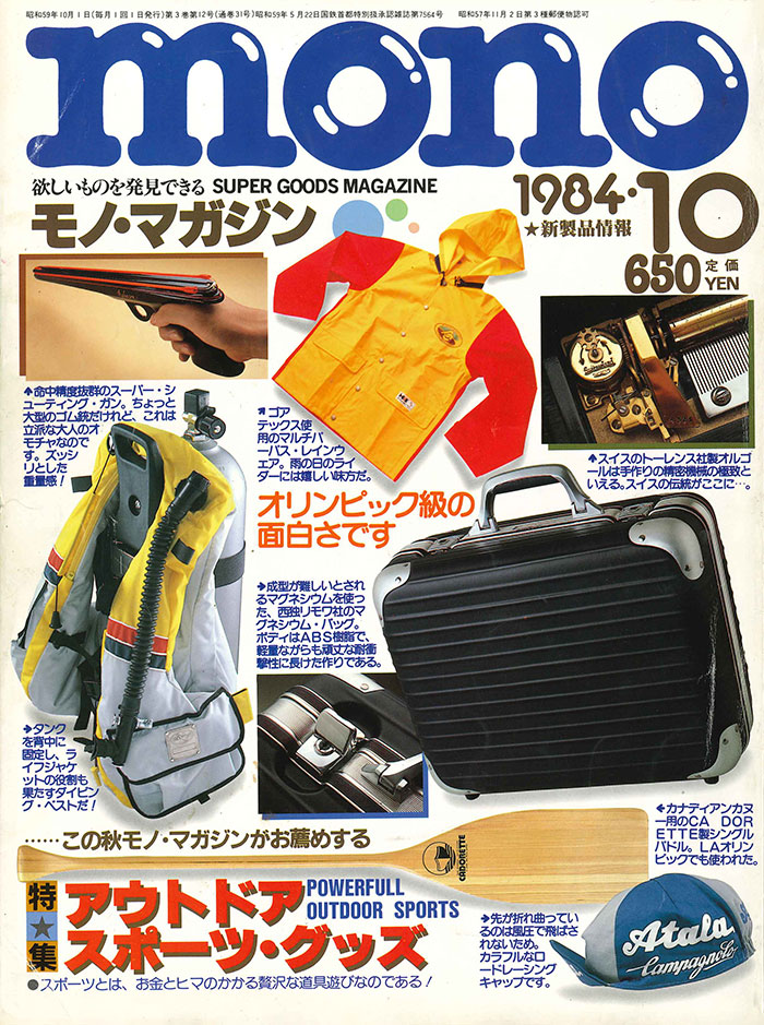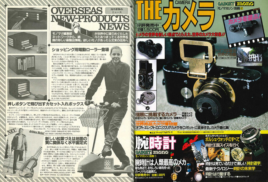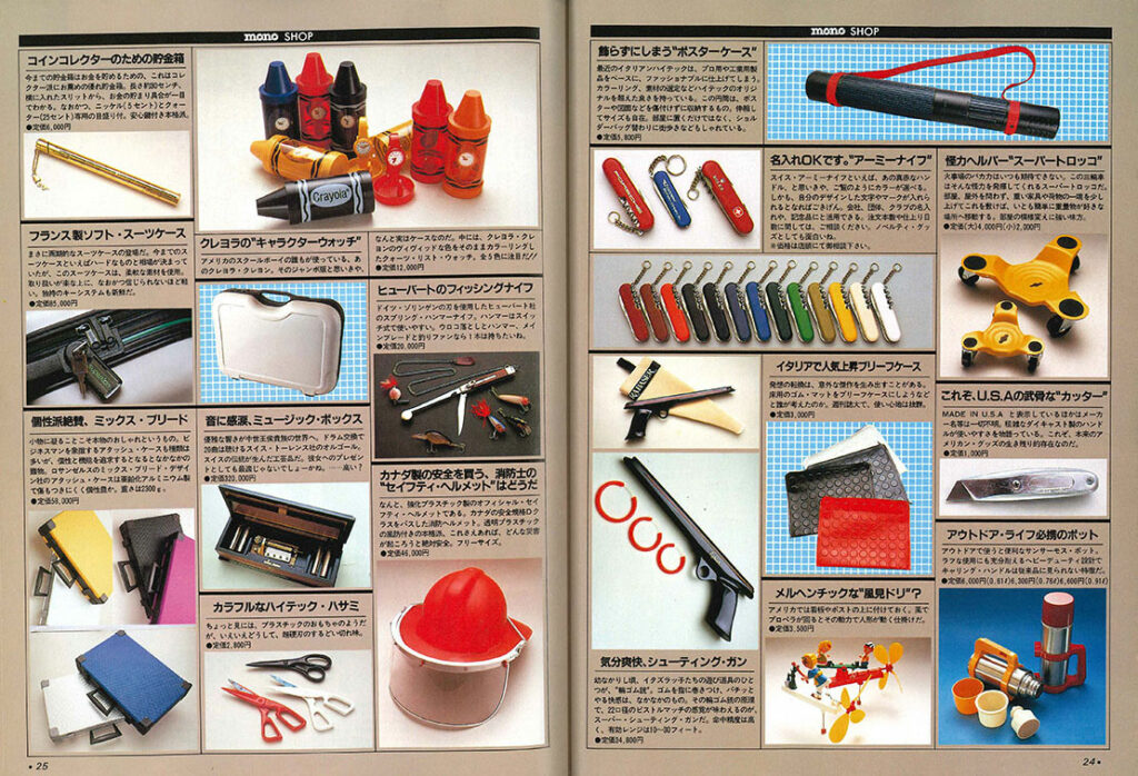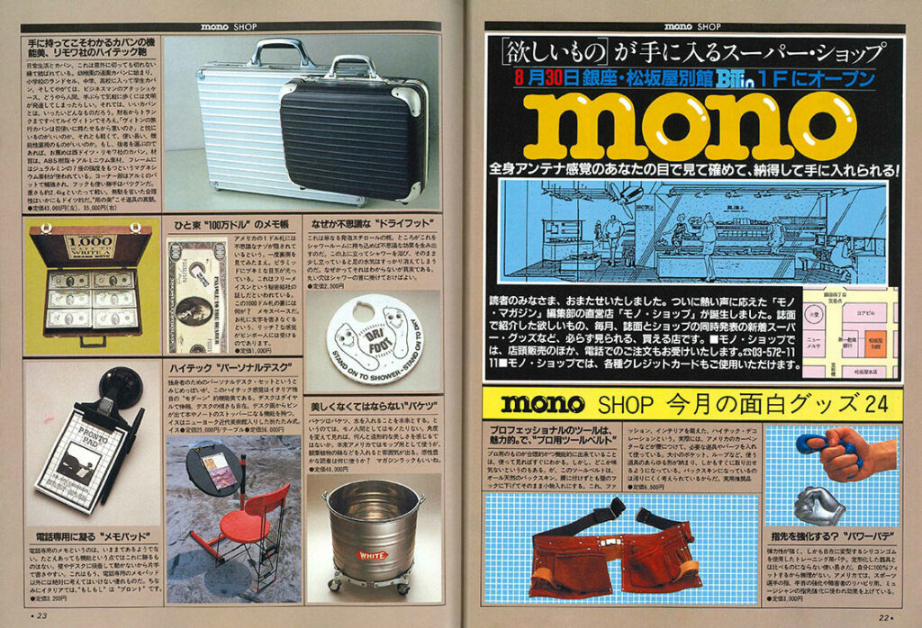 1984年8月30日、銀座・松坂屋別館(2012年8月末に閉館)1Fにモノ・マガジン編集部の直営店「モノ・ショップ」がオープンしましたというお知らせと、店舗に並ぶモノの中から見繕った「今月の面白グッズ24」です。今見てもなかなか楽しいラインナップ。カラー4ページ構成。