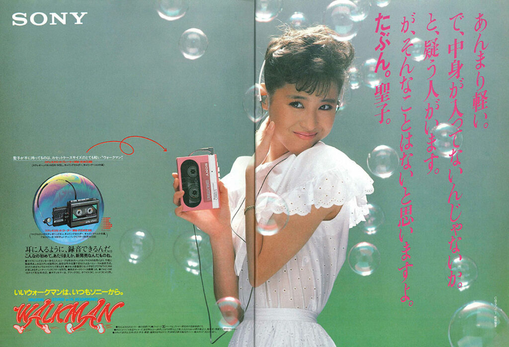 ふたつ目の広告はSONYの「ウォークマン」。モデルは聖子ちゃんこと、松田聖子さんです。写真ではヘッドホンをつけるために耳を出されてますが、前髪を目の上ギリギリで揃えてからの、サイドからバックにかけてはレイヤーを入れて毛先を後ろに流した、ふんわりボリューム感のある「聖子ちゃんカット」は80年代の女子たちの間で大流行してたんですよ。街中に聖子ちゃんの髪型をした女子がいたんですよ。