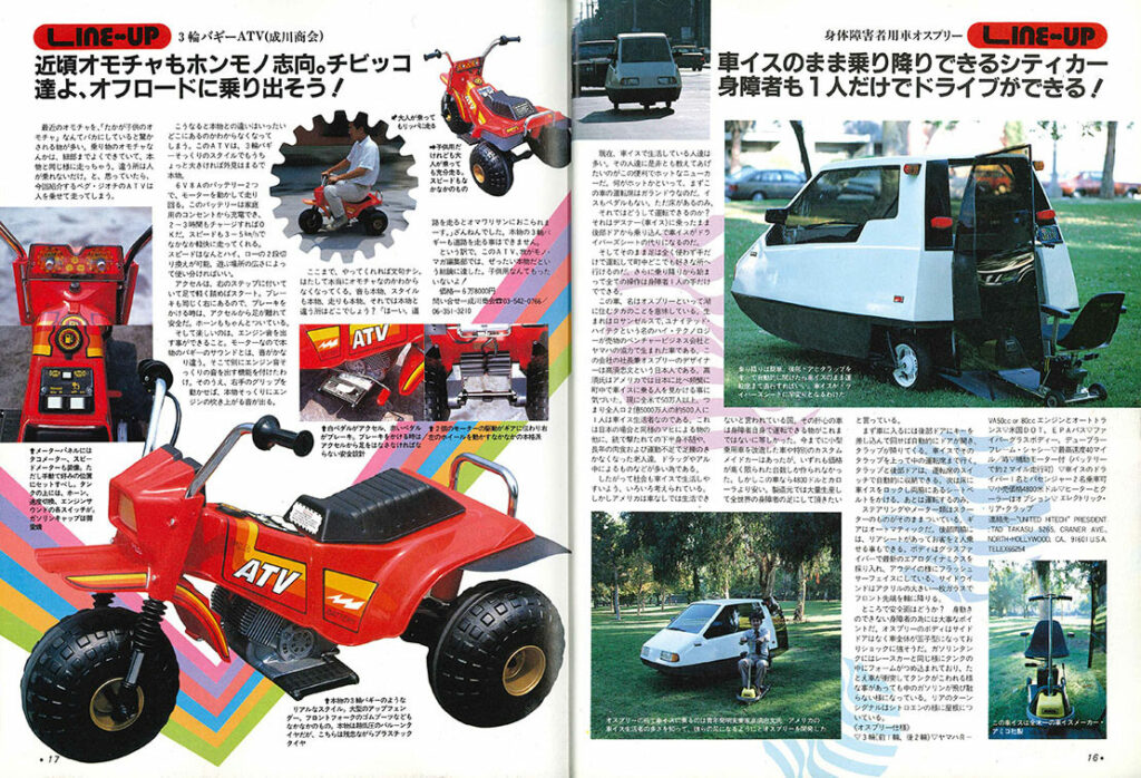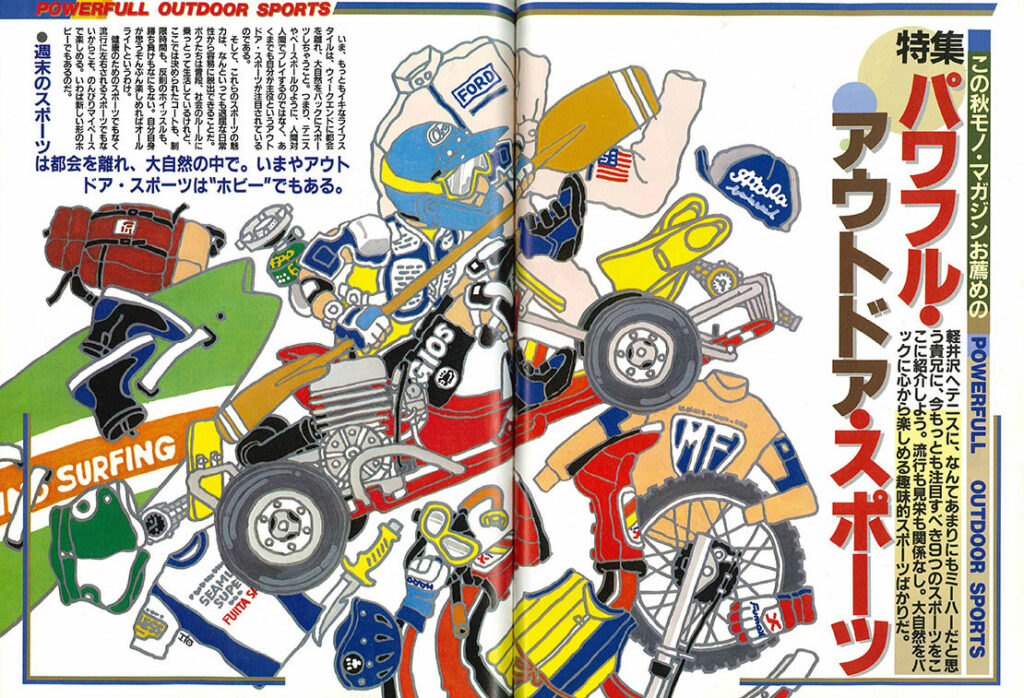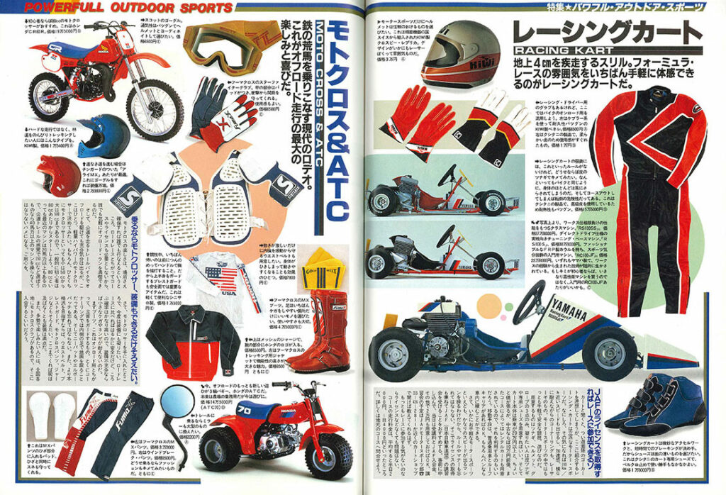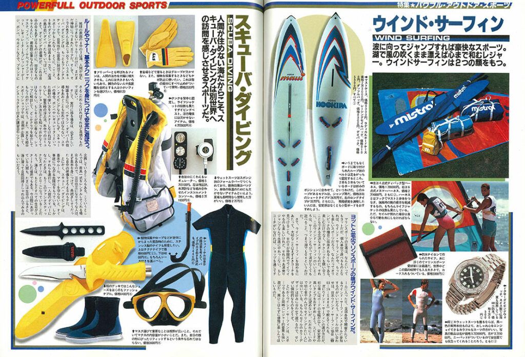 そして、「特集 パワフル・アウトドア・スポーツ」です。カラー16ページで「レーシングカート」「モトクロス & ATC」「BMX」「ロードサイクリング」「ウインド・サーフィン」「スキューバ・ダイビング」「カヌー」「フィッシング」「ハングライダー」「パワフル・アウトドア・スポーツを楽しむためのグッズいろいろ」「レジャー・ビークルを抜きにしてアウトドアは楽しめない」をギュッと詰め込んで紹介してます。