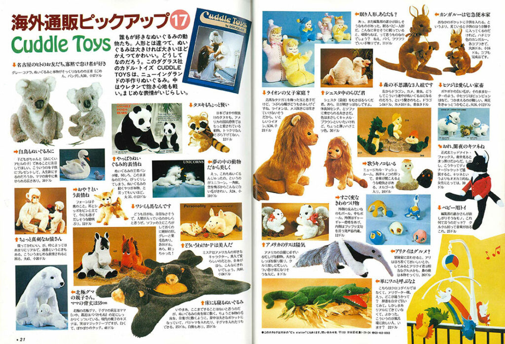 「海外通販ピックアップ」のページ、今回は「Cuddle Toys」という手作りぬいぐるみの通販カタログです。どのぬいぐるみもイマイチ垢抜けてないというか、味があるというか、時代特有の空気を纏ってます。