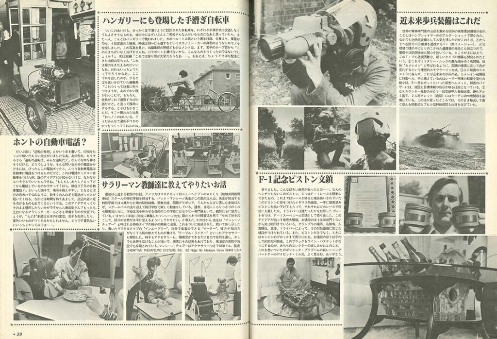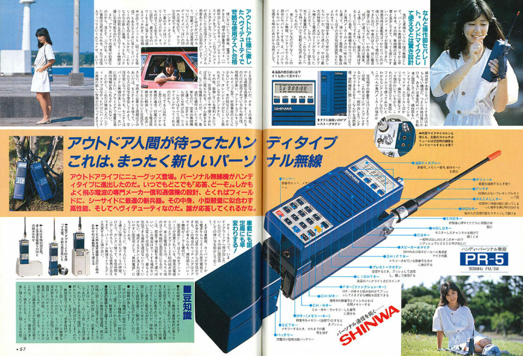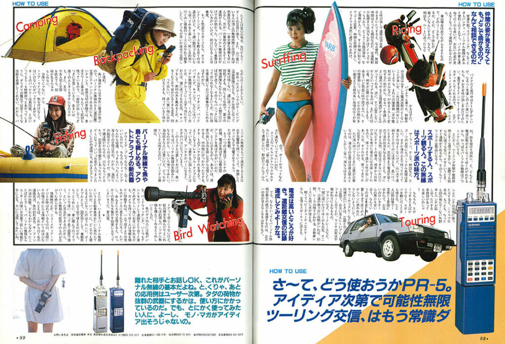 「アウトドア人間が待っていたハンディタイプ これは、まったく新しいパーソナル無線」はカラー4ページ構成。ちょこちょこ登場するパーソナル無線は、2021年末に完全に免許制度が終了。現在では使用できなくなってます。「ハンディタイプ」ではあるんですが、スマホと比べるとデカイ! でも、スマホのない時代なんですから、確かに重宝されてもおかしくないワケです。それにしても、技術の進化ってスゴイですね。