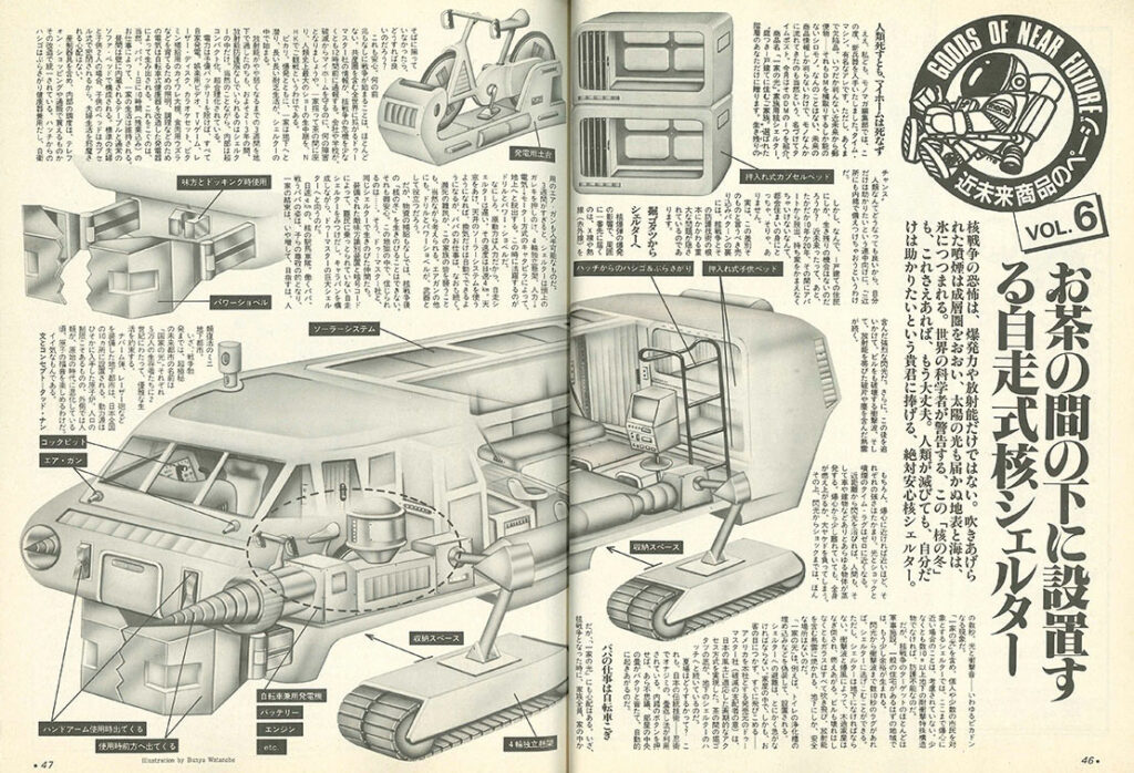 「近未来の商品ページ」はモノクロ2ページ構成。今回は「お茶の間の下に設置する自走式核シェルター」の紹介、というか、ほぼほぼディストピアSF小説のようなお話です。