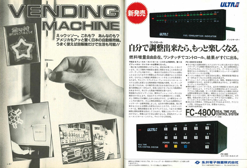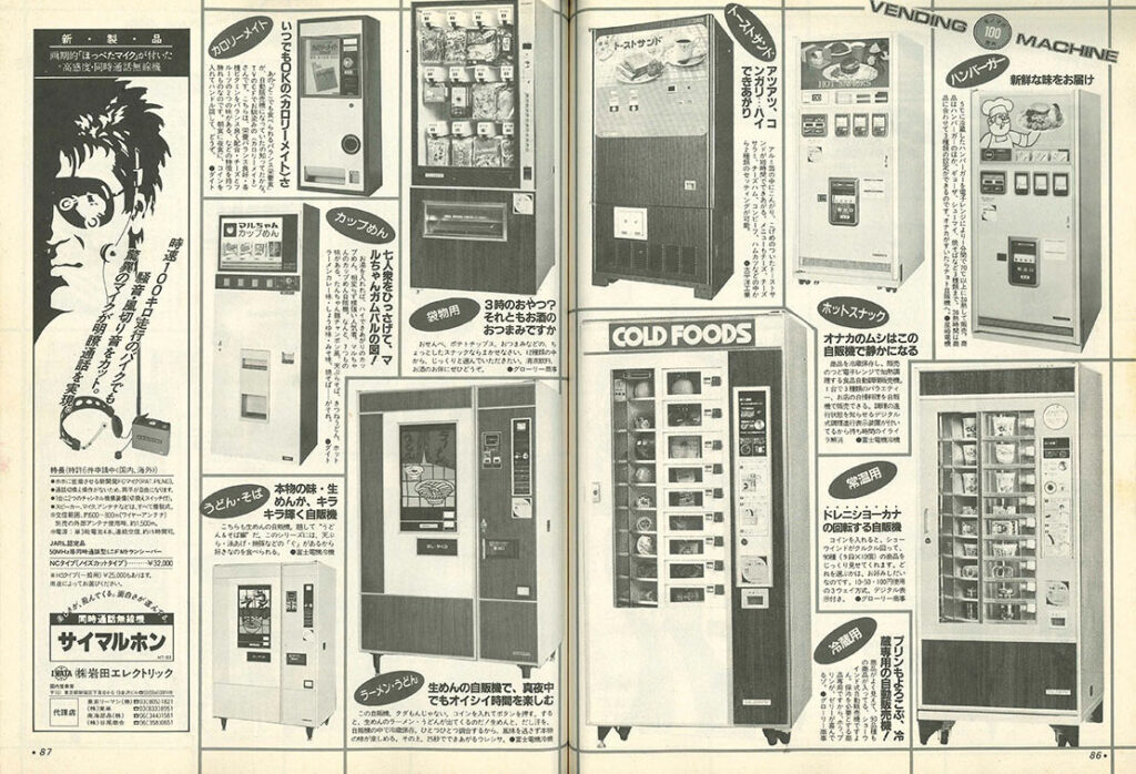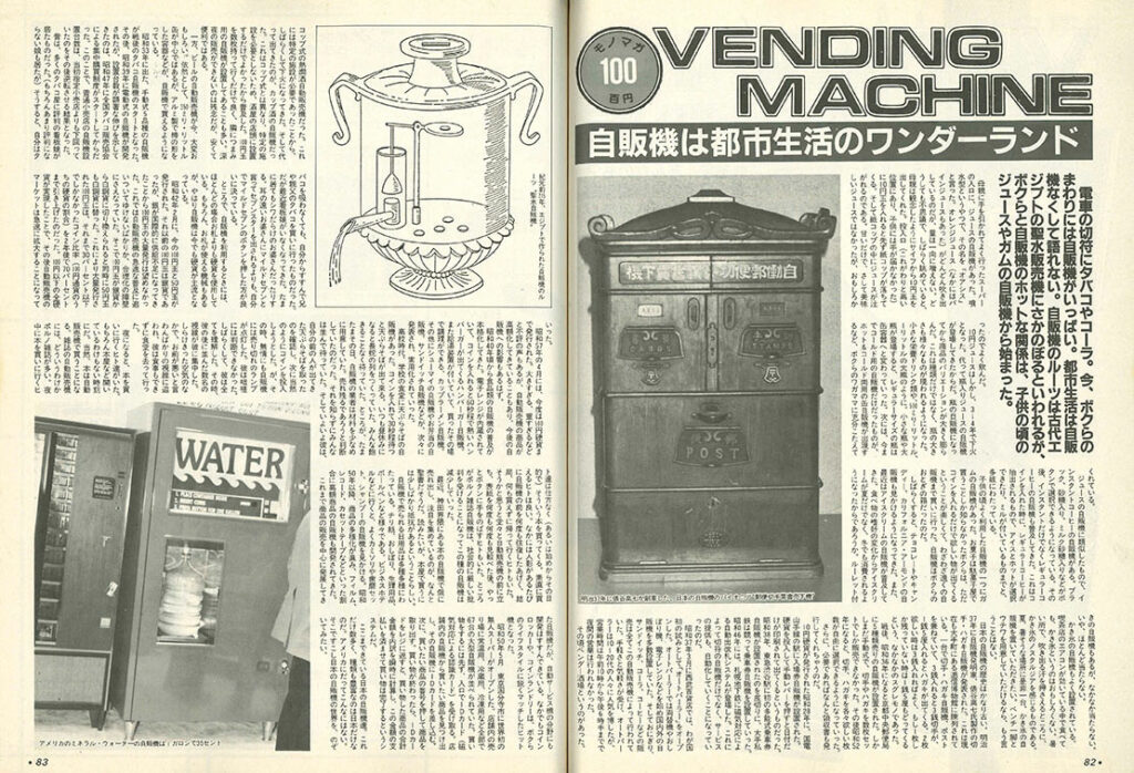 続きまして、モノクロ15ページで「特集 VENDING MACHINE 自動販売機は都市生活のワンダーランド」。リードには「えっウッソー。これも? あんなのも? アメリカもアッと驚く日本の自動販売機(ベンディングマシーン)。うまく使えば自販機だけで生活も可能!!」とあります。実に自動販売機がワンダーランドたり得た時代なんですね。24時間やってるコンビニが出てくるのがもうちょっとあとなんですよ。コンビニがあれば事足りる時代、便利になりましたねぇ。