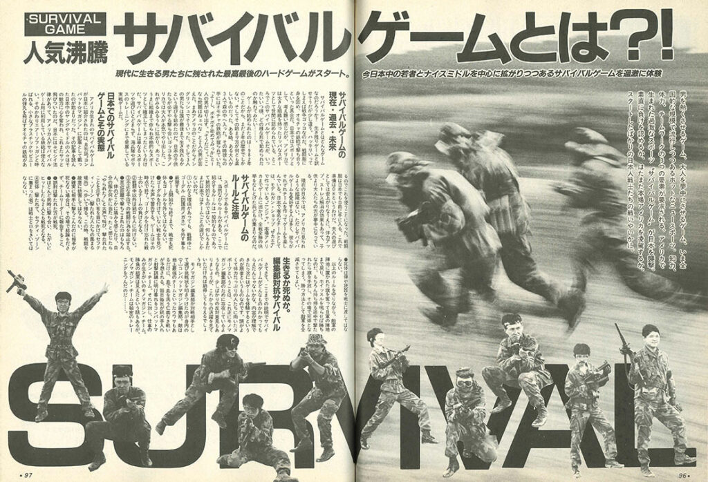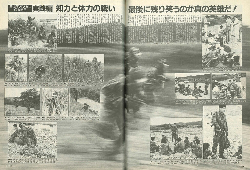 さらにモノクロ6ページ構成の「人気沸騰 サバイバルゲームとは?!」。装備についても解説しながら、モノ・マガジン編集部 VS コンバットマガジン(休刊)編集部の熱い戦いをレポートしてます。