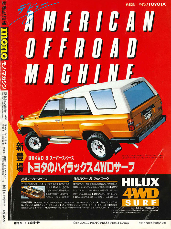 表4の広告はトヨタの「ハイラックス4WDサーフ」です。赤い地にクルマの切り抜き写真。バックには白ヌキ、シャドウ付きの “AMERICAN OFFROAD MACHINE”。ビシッと見た目にインパクトのあるレイアウトです。