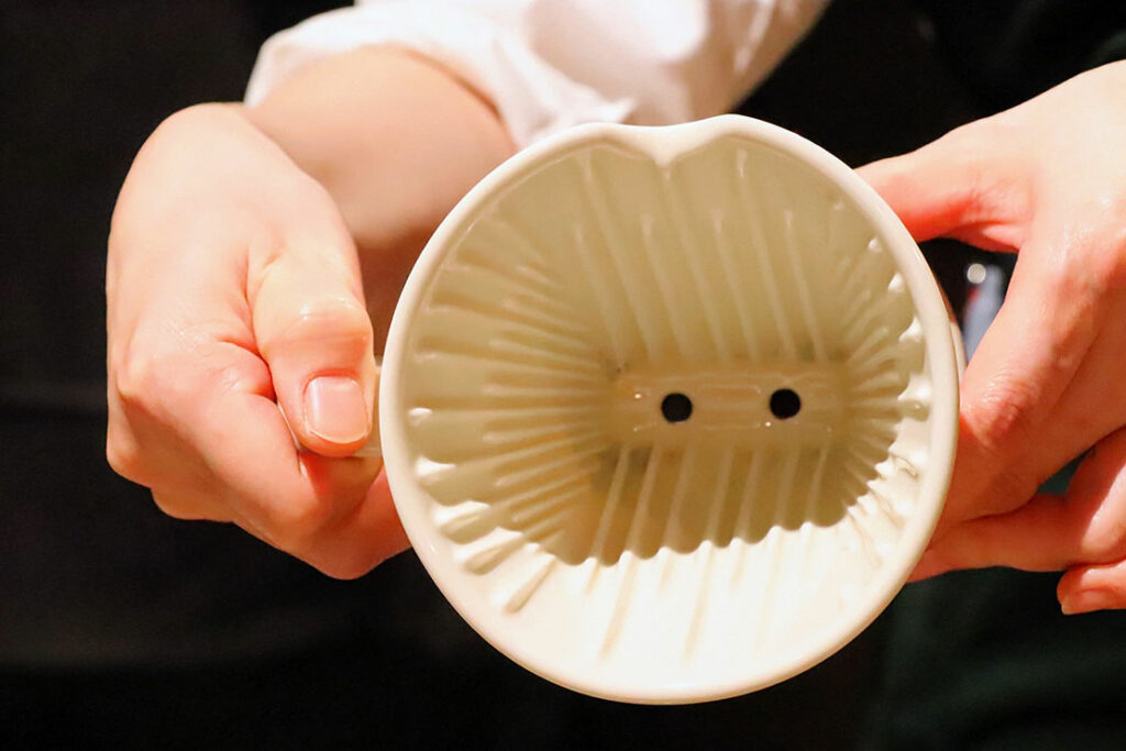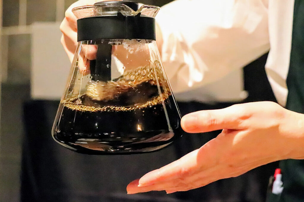コーヒーはお湯を注ぐと、最初に濃い味わいの成分が落ち、時間が経つにつれてすっきりとした味わいの成分が落ちてくる。そのため、抽出が終わったらサーバーを軽く3回ほど回して撹拌し、全体のテイストを均一に整える。ポイントは、サーバーを優しく回すことだ。