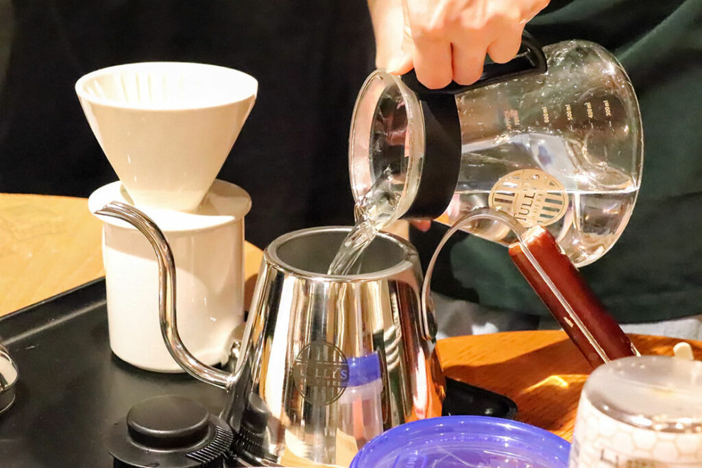 まずは、通常より穴が大きめで、側面に深い切り込みが入ったタリーズオリジナルドリッパーにサーバーを重ね、沸騰したお湯を注いで器具全体を温める。