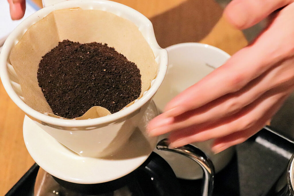 そこへブラジル NEW CROP の豆を、ピーンズスプーンで3杯(1杯=約30g)入れる。このとき、粉を均等に広げるためにドリッパーを軽くトントンと叩くのがポイントだ。