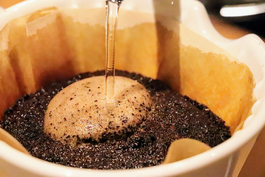 中心から外側に向かってお湯を注いだら、まずは蒸らす。30秒ほど経ったら、再び中心に向けて、500円玉ほどの大きさの円を描くようにお湯を注ぐ。粉がモコモコと膨らんできたら、内側に“土手”をつくるように注ぎ続ける。このとき、ドリッパーの側面に沿ってお湯をかけないことがポイントだ。