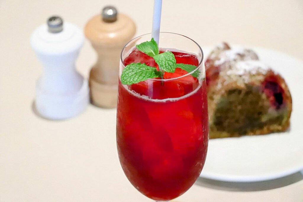 ハイビスカスとローズヒップの華やかな酸味に、ミントシロップの清涼感。春の風をそのままグラスに閉じ込めたような、軽快な一杯だ。ウーロン&チェリーバントケーキとのペアリングにも華が咲く!1300円