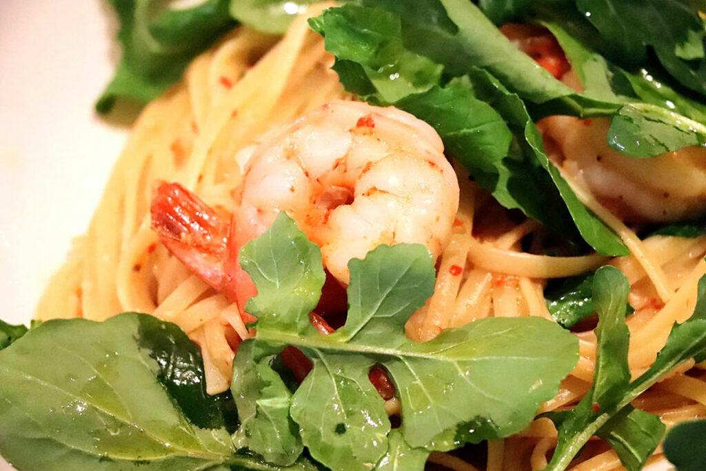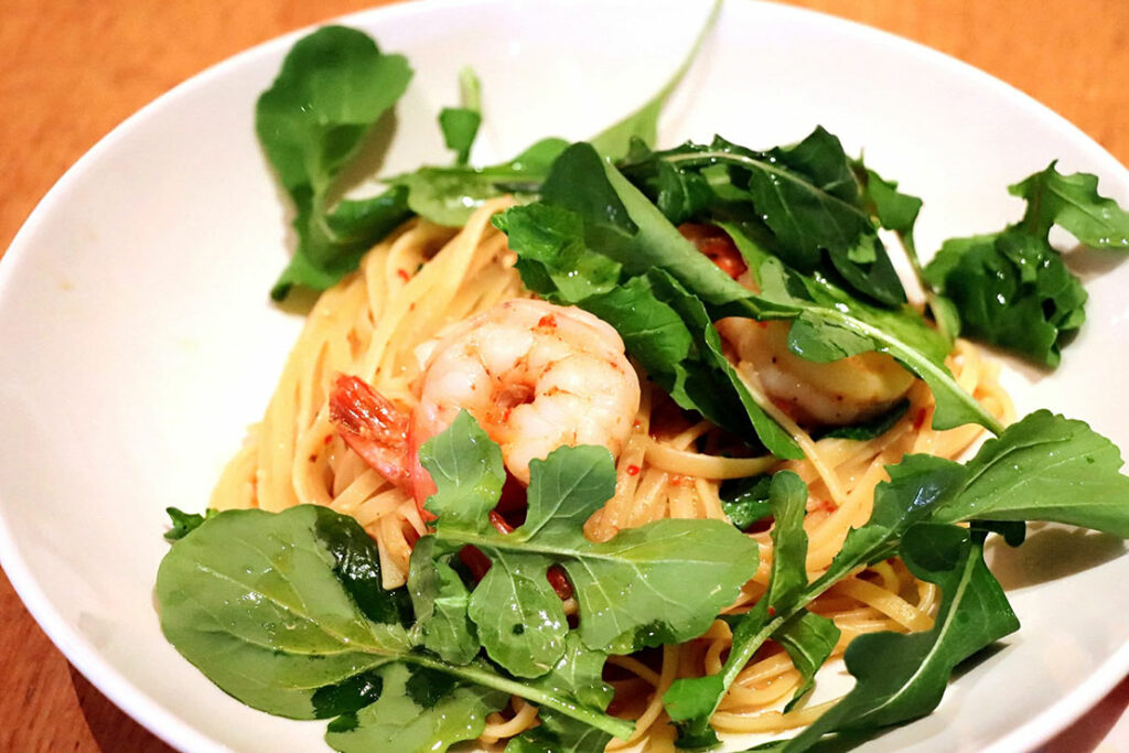 エビとルッコラのリングイネ(ガーリックチリオイル・レモン)