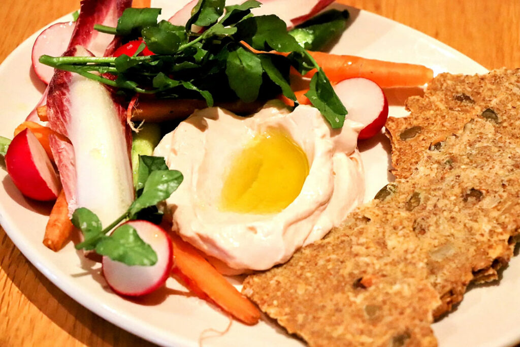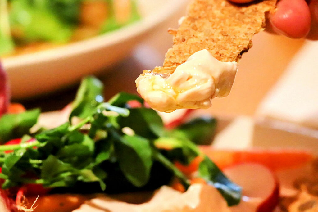 明太子の塩味が効いたなめらかなホイップは、彩り豊かな旬野菜と自家製「クリスプブレッド」との相性抜群! 明太子の塩味と辛味を “重くせず” にまとめてあるぞ。