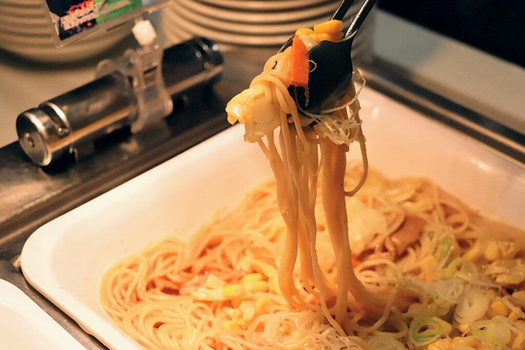 宮下 企業秘密になりますが、北海道の味に合わせるアップデートは行っています。例えば、スープスパゲッティ。味噌ラーメンの “スープ” を表現したかったのですが、商品を出して時間がたつとパスタがスープをすってしまい、味がぼやけてしまいます。ですので、お出ししてからの時間、途中でのスープの濃さなどチェックしています。