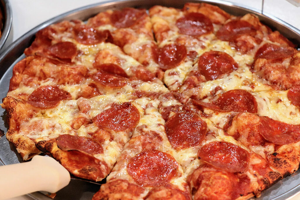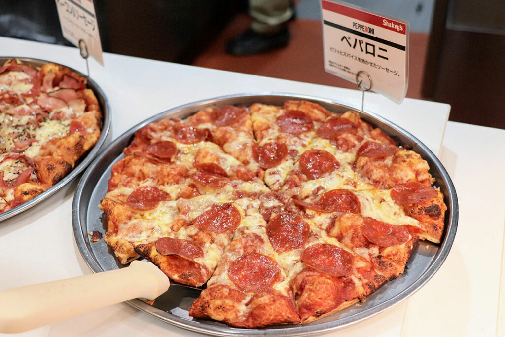 焼きたてのペパロニは、縁がほんのりとカールし、脂が表面で小さく弾けている。噛んだ瞬間に広がるのは、鋭い塩気とスパイスの香り。この “キレ” が、シェーキーズ特有の軽いクリスピー生地と驚くほどよく合う一枚。ねこやま一押しのペパロニ!