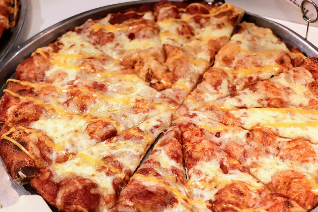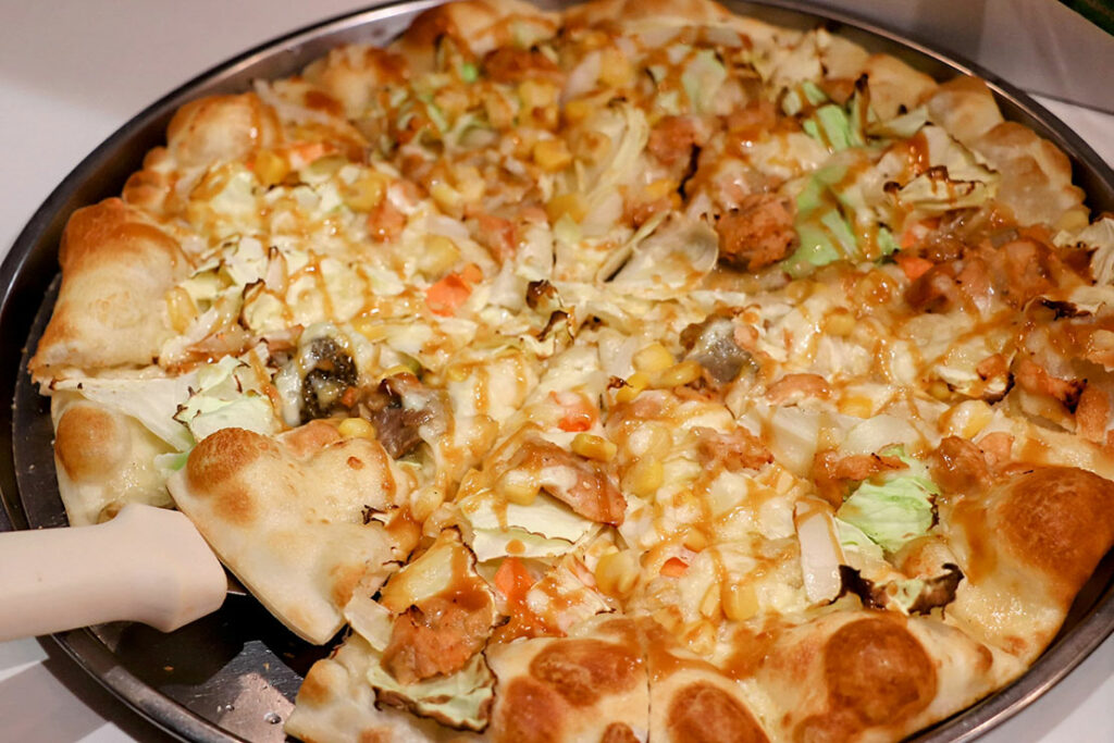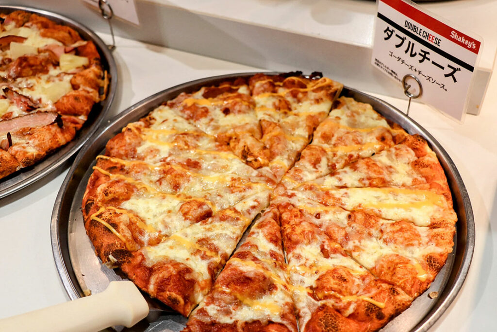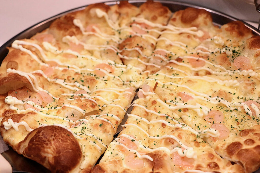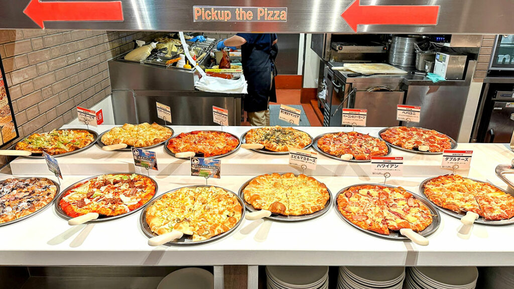 常時10種類以上の焼きたてピザが並ぶカウンターは、店内で最も熱量の高いエリアだ。香ばしい匂い、焼き上がりの湯気、次々と補充されるピザのビジュアル、五感を一気に刺激してくる。さらに嬉しいのは、カウンターに並んでいないピザもオーダーすれば焼いてくれること。“食べたいものを、食べたいタイミングで” というシェーキーズの自由度が、ここでしっかり体験できる。