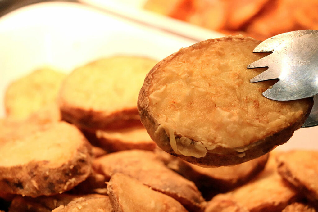 派手さはないのに、バイキングの流れをふっと柔らかく変える “緩急の一枚” としての存在感がある。広がるのは “マヨのまろやかさ”。焼きたての表面に薄く焼き色がついたマヨネーズは、酸味よりもコクが前に出るタイプで、熱によってふわっと甘みが立つ王道の一枚だ。