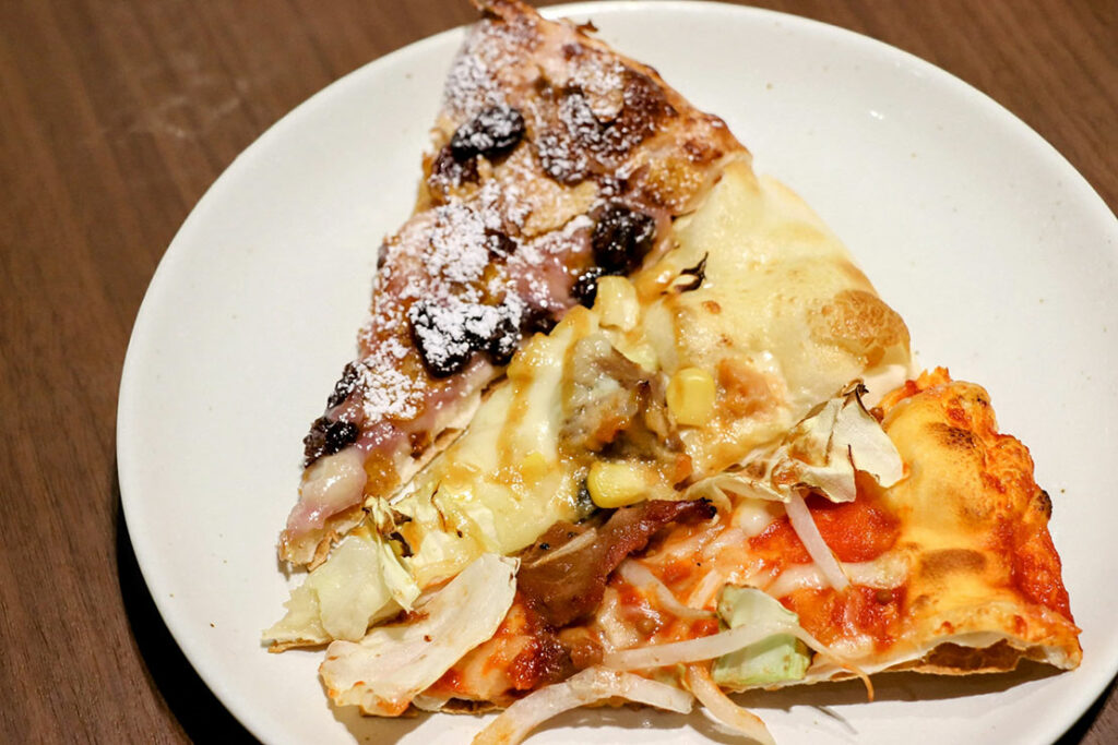 北海道土産のお菓子をイメージしたデザートピザ。ホワイトチョコレートに、ブルーベリー&ハスカップのソース、さらにバターソースを合わせたフィリングを生地いっぱいに広げ、ラム風味シロップに漬けたレーズンをトッピング。“北海道土産のお菓子” らしい甘酸っぱさと濃厚さを、シェーキーズ流にピザで表現した一枚だ。完全に振り切ったフレーバーで、とにかく新しい。