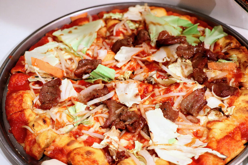 北海道名物・ジンギスカン鍋をモチーフにした一枚。トマトベースの生地にチーズと野菜、オーブンで焼き上げたラム肉、そしてもやしをトッピング。