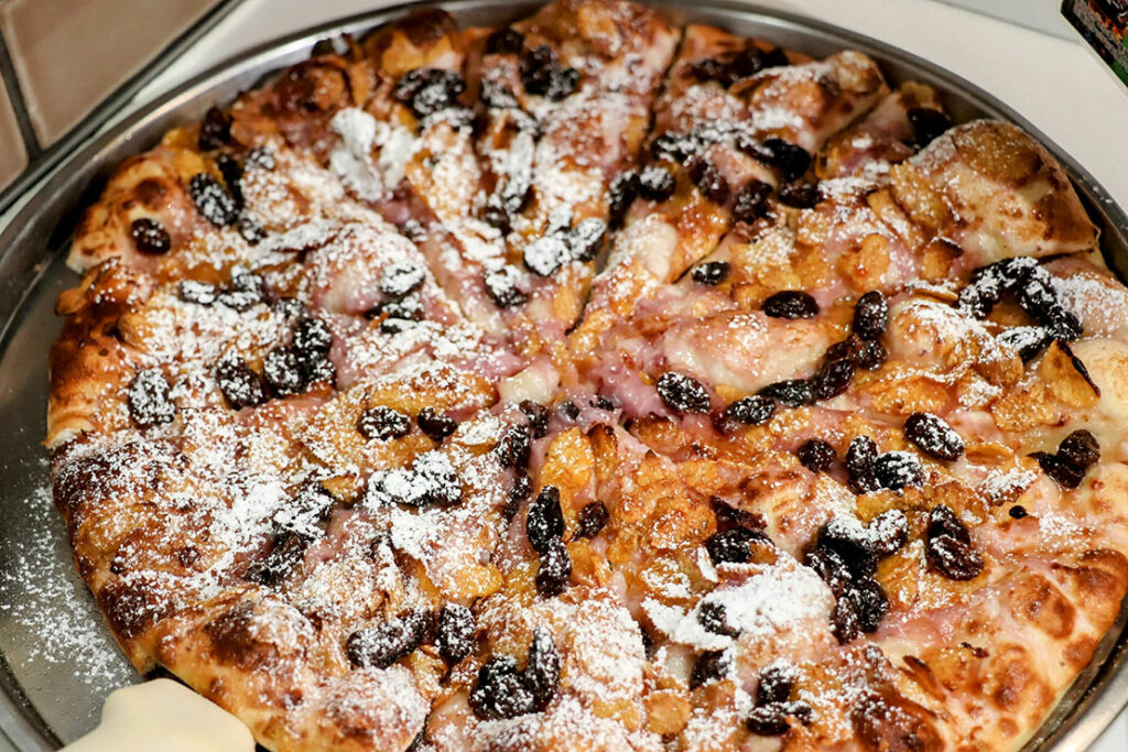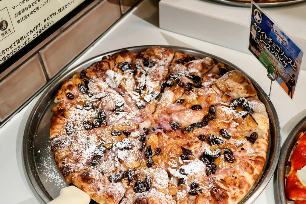 ホワイトチョコソースとレーズンのピザ