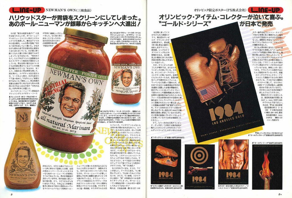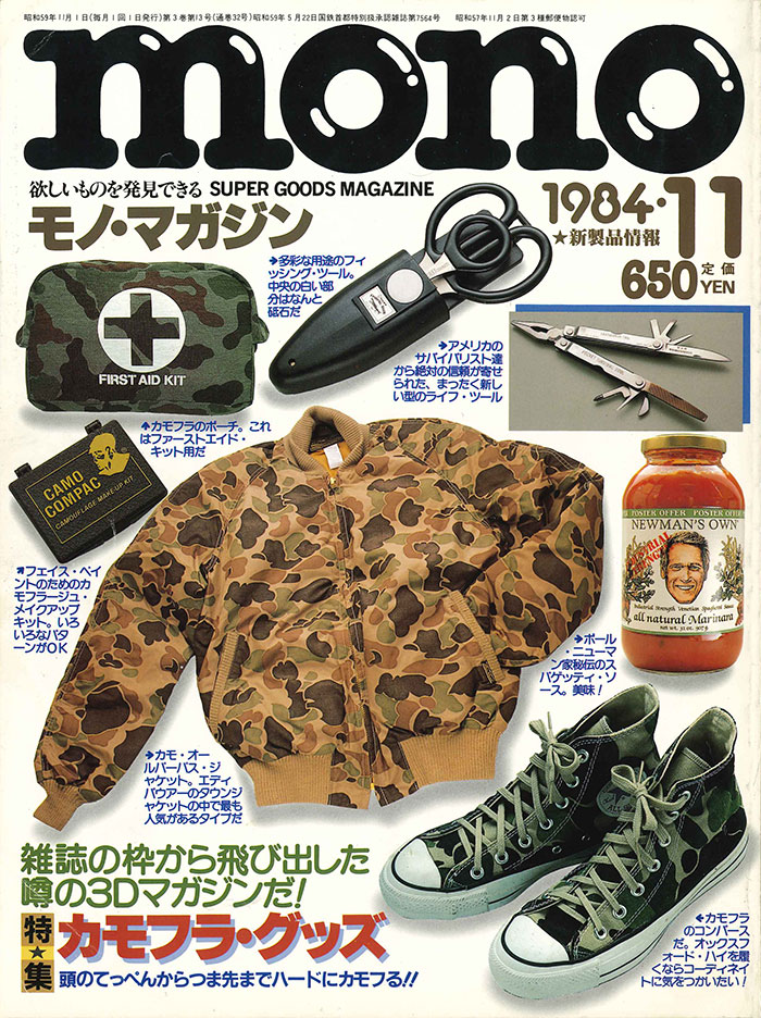 ハイ、これが29号の表紙です。今回は「特集 カモフラ・グッズ」で紹介してるアイテムがいくつか並んでます。真ん中のタウンジャケットはエディ・バウアーの「カモ・オールパーパス・ジャケット」、右下のがコンバースの「キャンバス・オールスター・ハイ・カモフラージュ」です。その上にあるケチャップの瓶みたいのが、「LINE••UP」で紹介してる、名優ポール・ニューマン家秘伝のスパゲティ・ソース。「オペラ座近くの小粋なカフェテラスで食べているような気分にさせてくれる」味わいだそうです。