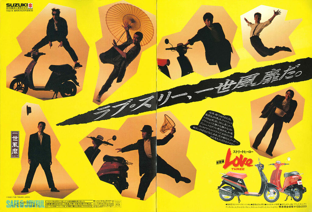 表紙を開いてひとつ目の広告は、SUZUKIのスクーター「Love THREE」。モデルをしているのは、80年代に活躍した「一世風靡セピア」の面々。メンバーには小木茂光さん、哀川翔さん、柳葉敏郎さんなどなど、すごい方達がいらっしゃいました。ソイヤ!