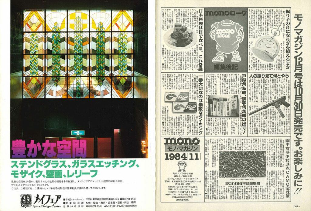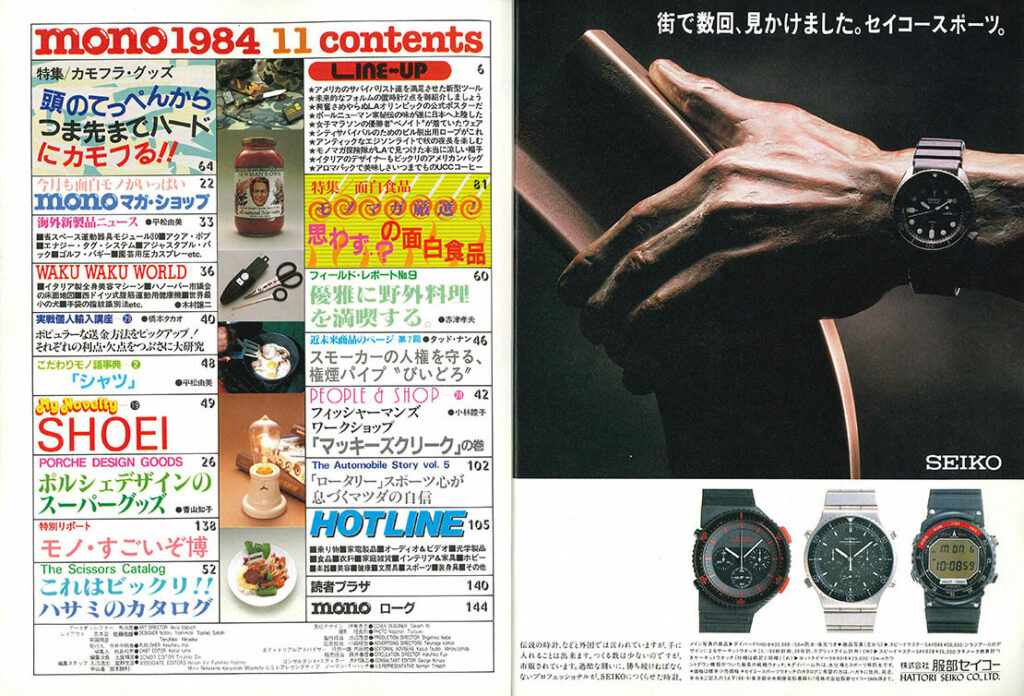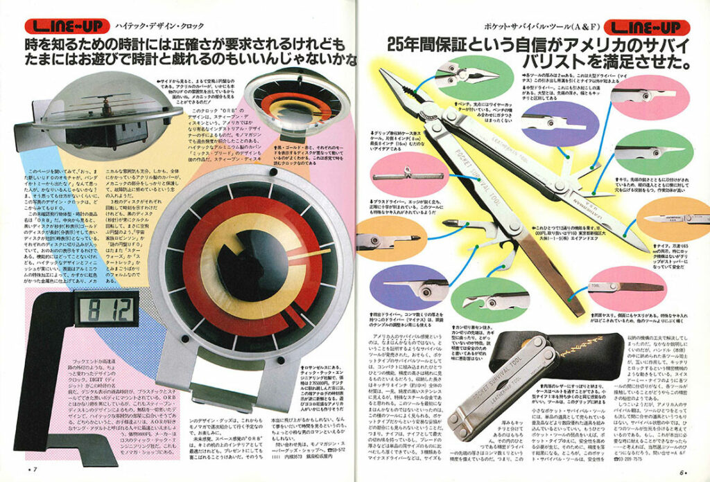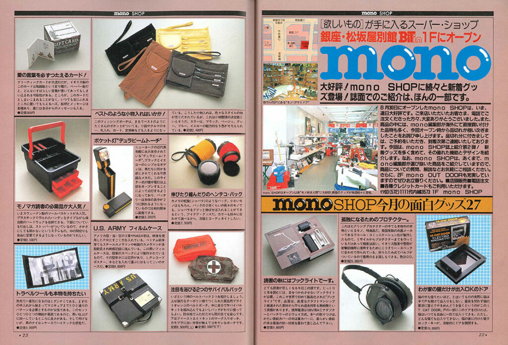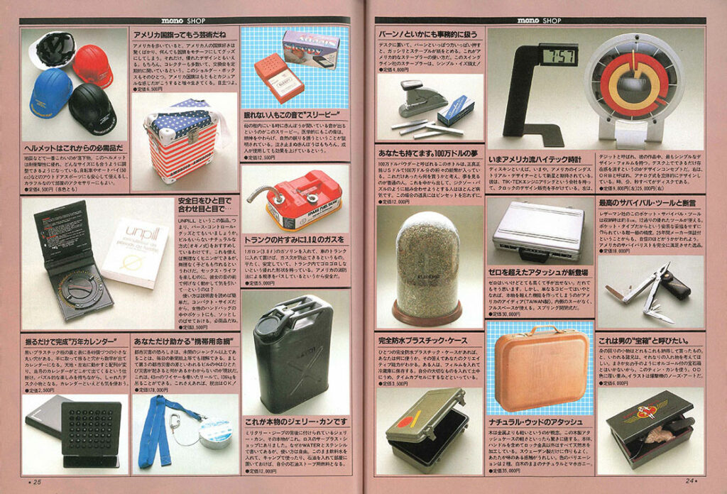 前号に引き続き、1984年8月30日、銀座・松坂屋別館(2012年8月末に閉館)1Fにモノ・マガジン編集部の直営店「モノ・ショップ」オープンのお知らせと、店舗に並ぶモノの中から見繕った「今月の面白グッズ27」。ガジェット感たっぷりの面白グッズが並んでます。