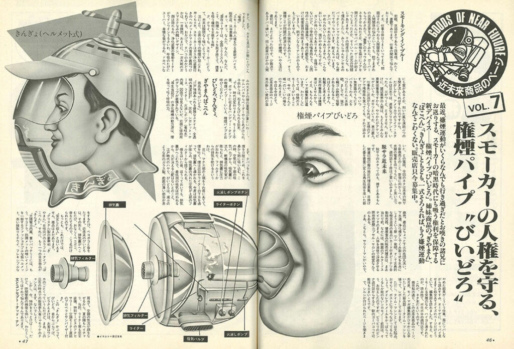 「近未来の商品ページ」はモノクロ2ページ構成。今回は「スモーカーの人権を守る、権煙パイプ “びいどろ”」の紹介、というか、今回もほぼほぼディストピアSFのようなお話です。なんだか息が詰まりそうな喫煙具で、禁断症状になったとしても、これはちょっと使いたく無いというのが喫煙者としての正直な感想です。
