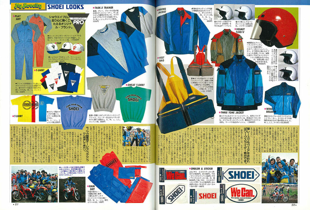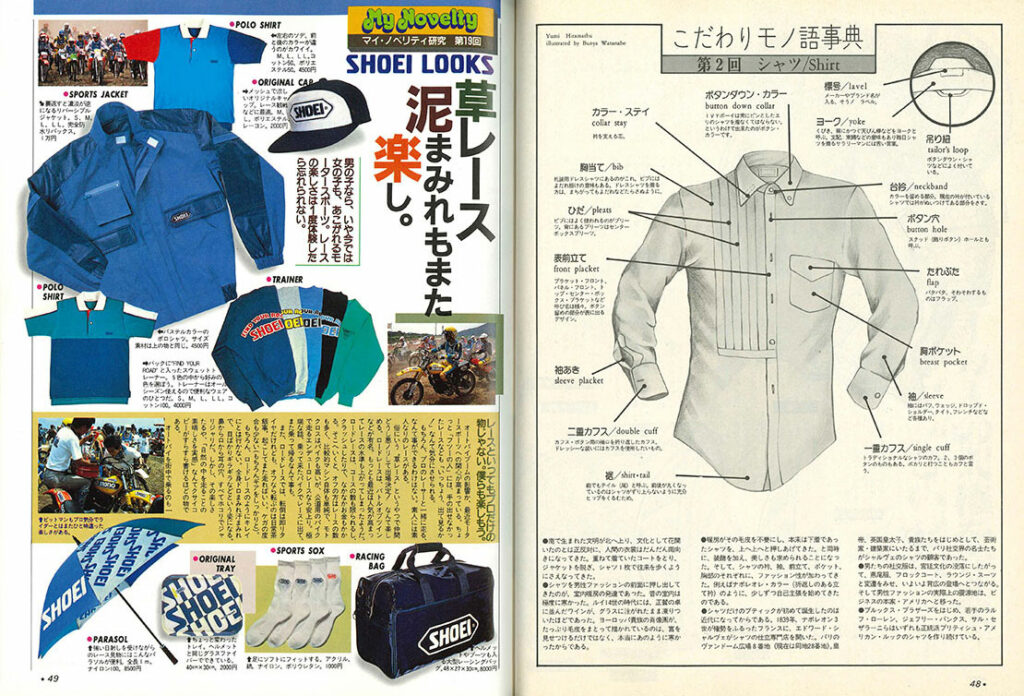 「My Novelty」はカラー3ページ構成。現在、世界のプレミアムヘルメット市場の売上高のなんと半数以上を誇っている「SHOEI(当時、昭栄化工株式会社)」のアイテムを紹介しつつ、モノマガ編集部がオフロードのバイクレースに参戦した模様もレポートしてます。