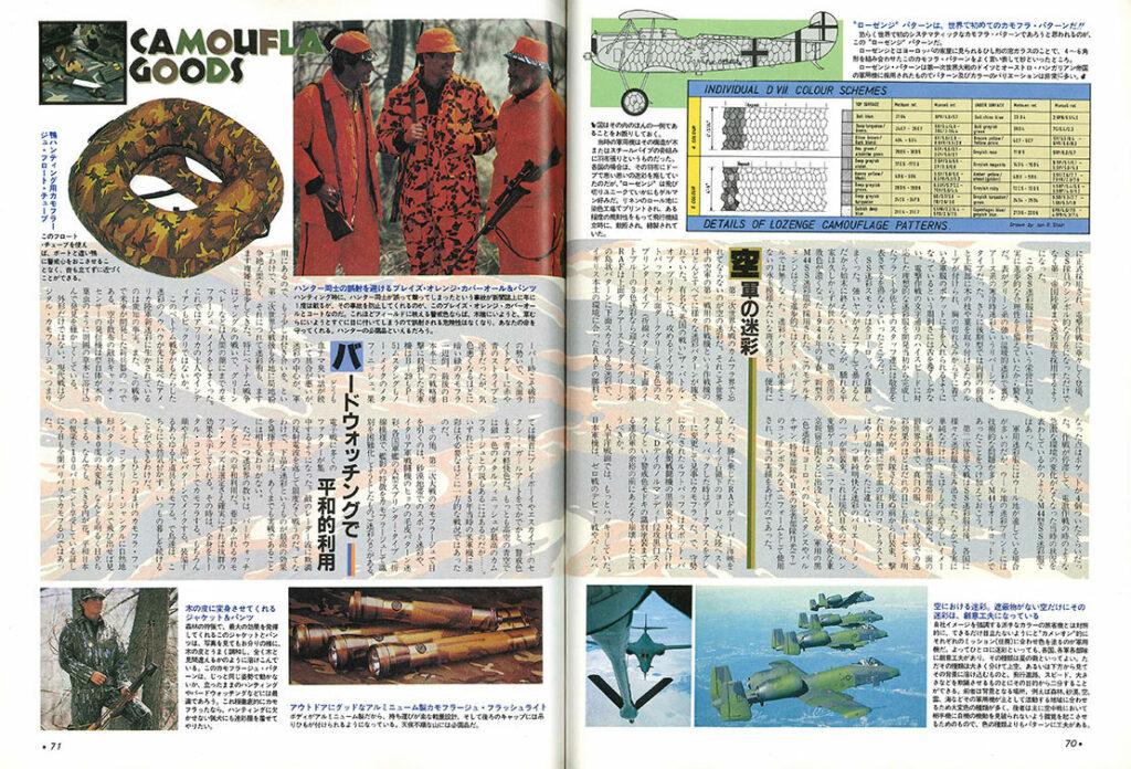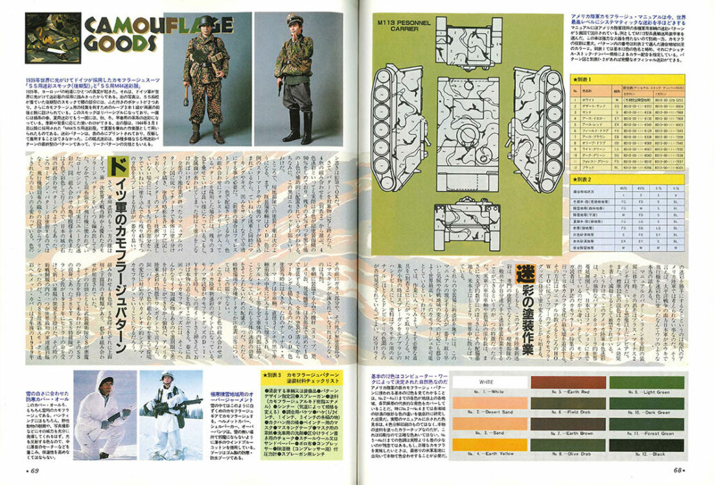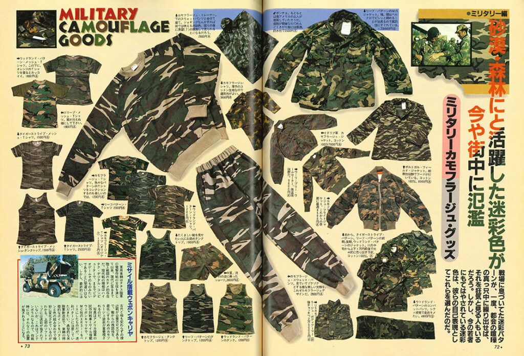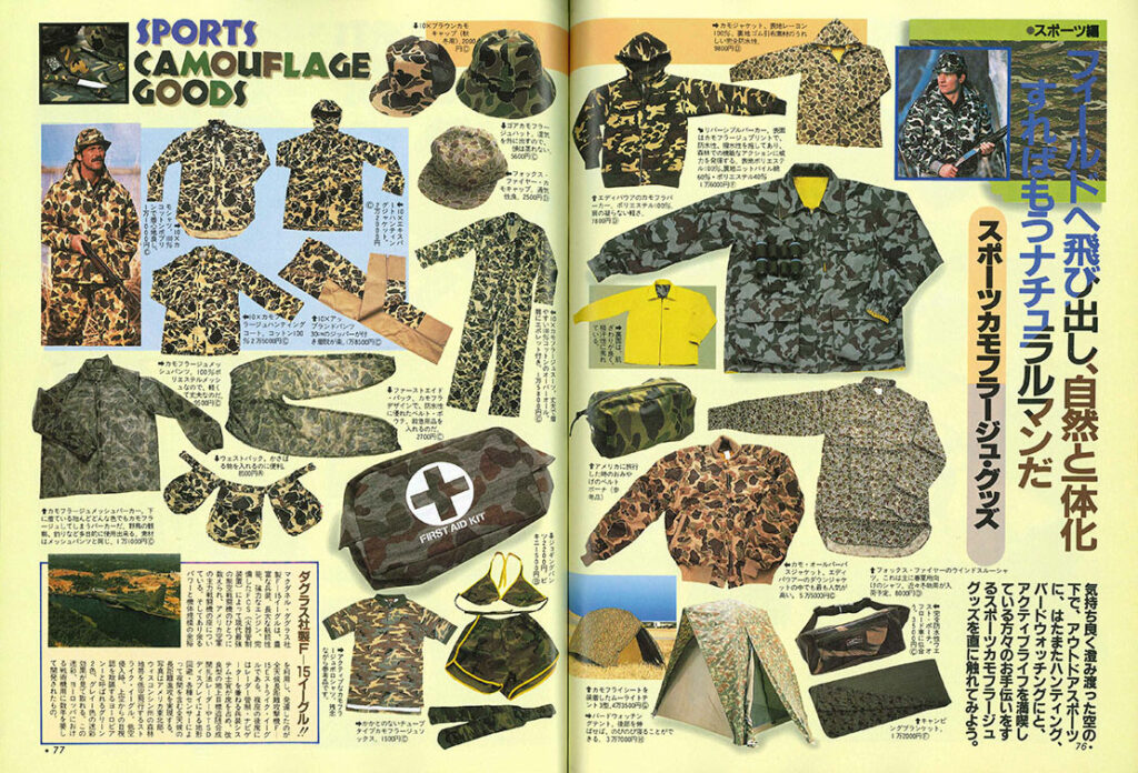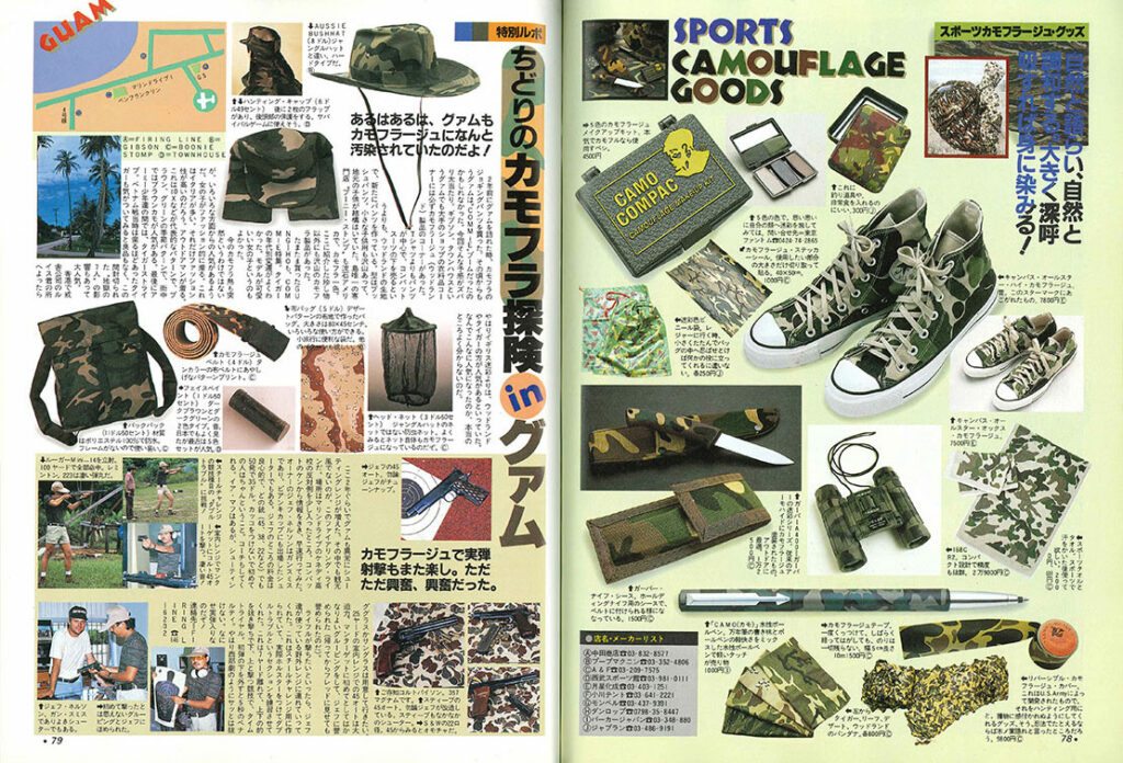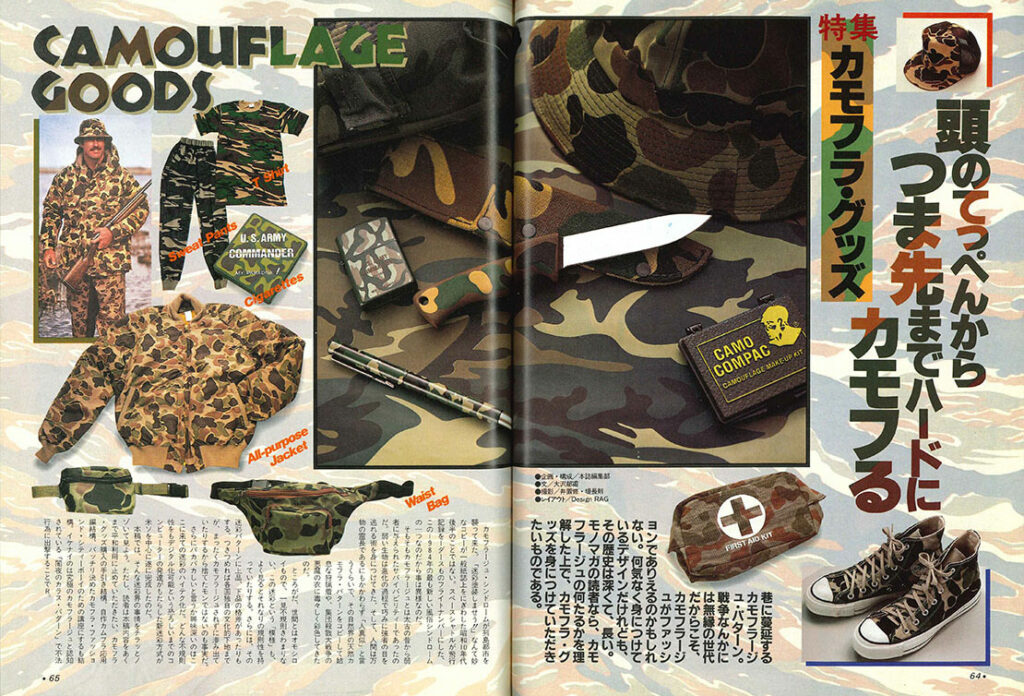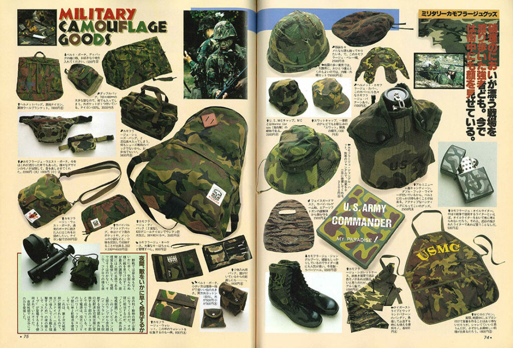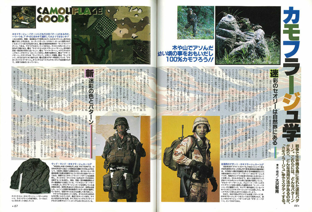 そして、「特集 カモフラ・グッズ 頭のてっぺんからつま先までハードにカモフる」です。気合の入ったカラー16ページ構成だったもんで、全ページの画像を載せときました。「巷に蔓延するカモフラージユ・パターン。戦争なんかには無縁の世代だからこそ、カモフラージユがファッションでありえるのかもしれない。何気なく身につけているデザインだけれども、その歴史は深くて、長い。モノマガの読者なら、カモフラージュの何たるかを理解した上で、カモフラ・グッズを身につけていただきたい たいものである。」というリードでスタートします。